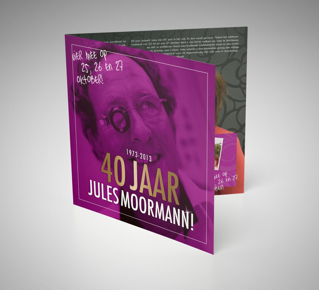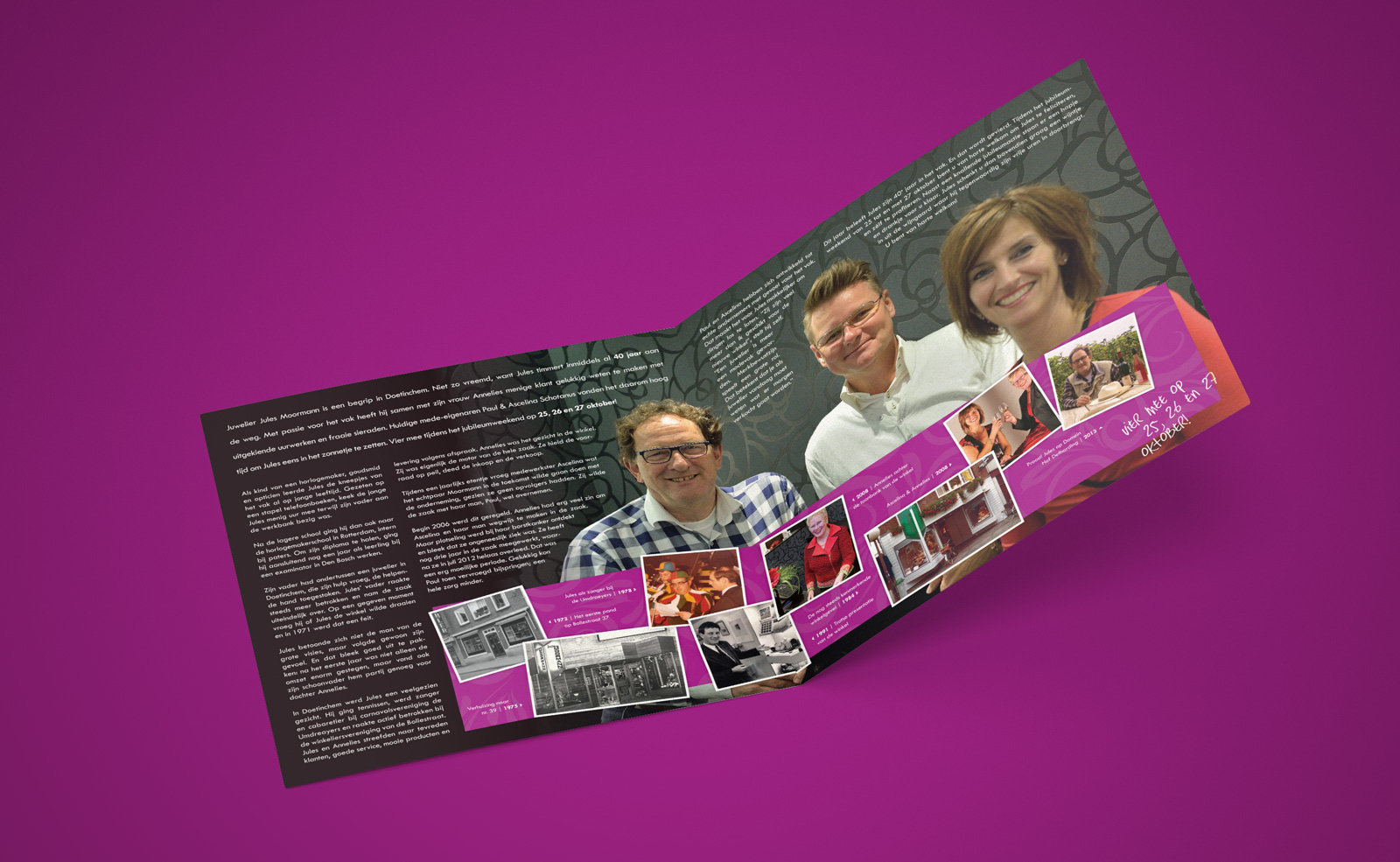 Juwelier Jules Moormann is een begrip in Doetinchem. Niet zo vreemd, want Jules timmert inmiddels al 40 jaar aan de weg. Met passie voor het vak heeft hij samen met zijn vrouw Annelies menige klant gelukkig weten te maken met uitgekiende uurwerken en fraaie sieraden. Huidige mede-eigenaren Paul & Ascelina Schotanus vonden het daarom hoog tijd om Jules eens in het zonnetje te zetten, via een jubileumweekend met een feestelijke jubileumcheque en deze jubileumfolder.