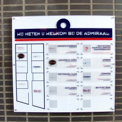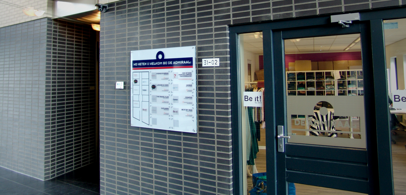 /in portfolio/door Roy KoolenbranderWij en onze buren zijn voortaan goed vindbaar, dankzij dit logobord in de entree, door ons verzorgd voor bedrijfsverzamelgebouw De Admiraal Doetinchem. Het bord zelf is uitgevoerd in mooi dik plexiglas en de huurders worden aangeduid via statische bestickering.
