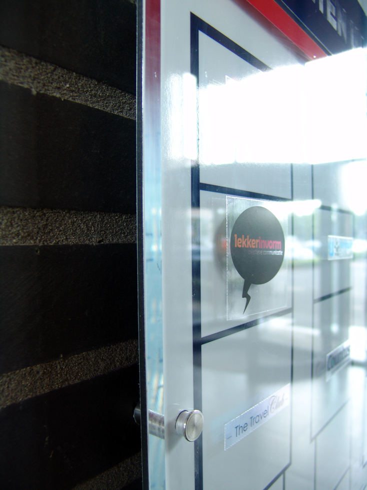/in portfolio/door Roy KoolenbranderWij en onze buren zijn voortaan goed vindbaar, dankzij dit logobord in de entree, door ons verzorgd voor bedrijfsverzamelgebouw De Admiraal Doetinchem. Het bord zelf is uitgevoerd in mooi dik plexiglas en de huurders worden aangeduid via statische bestickering.