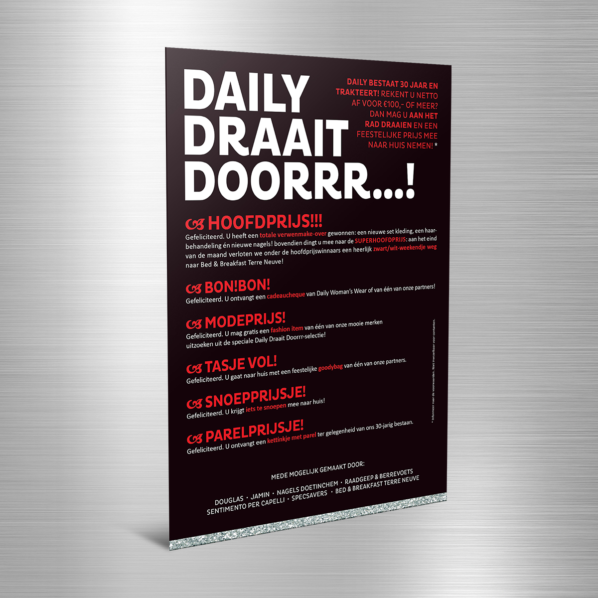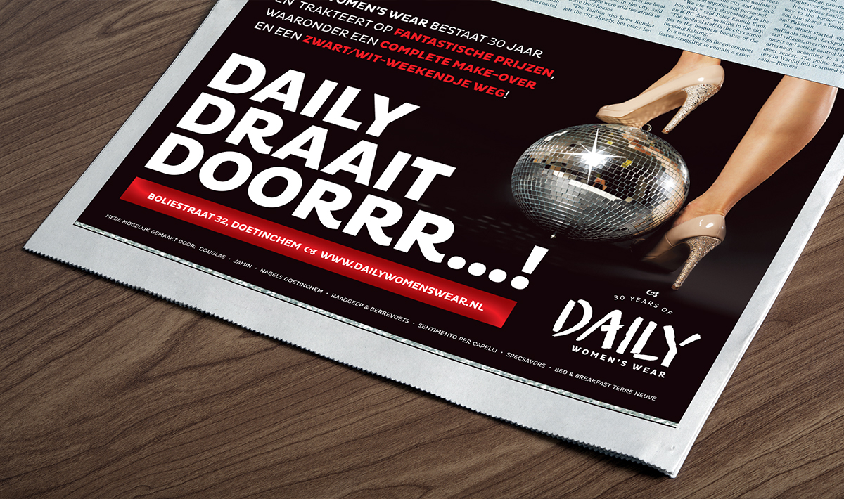 Daily women’s wear bestaat 30 jaar en dat mag gevierd worden! Na je aankoop in de winkel mag je daarom aan het Rad van Avontuur draaien, en maak je kans op leuke prijzen! lekker in vorm verzorgde hiervoor de ontwerpen en teksten, in de vorm van een advertentie, persberichten, posters, flyer en niet te vergeten het Rad van Avontuur zelf. Drrrrrrrraaien maar!