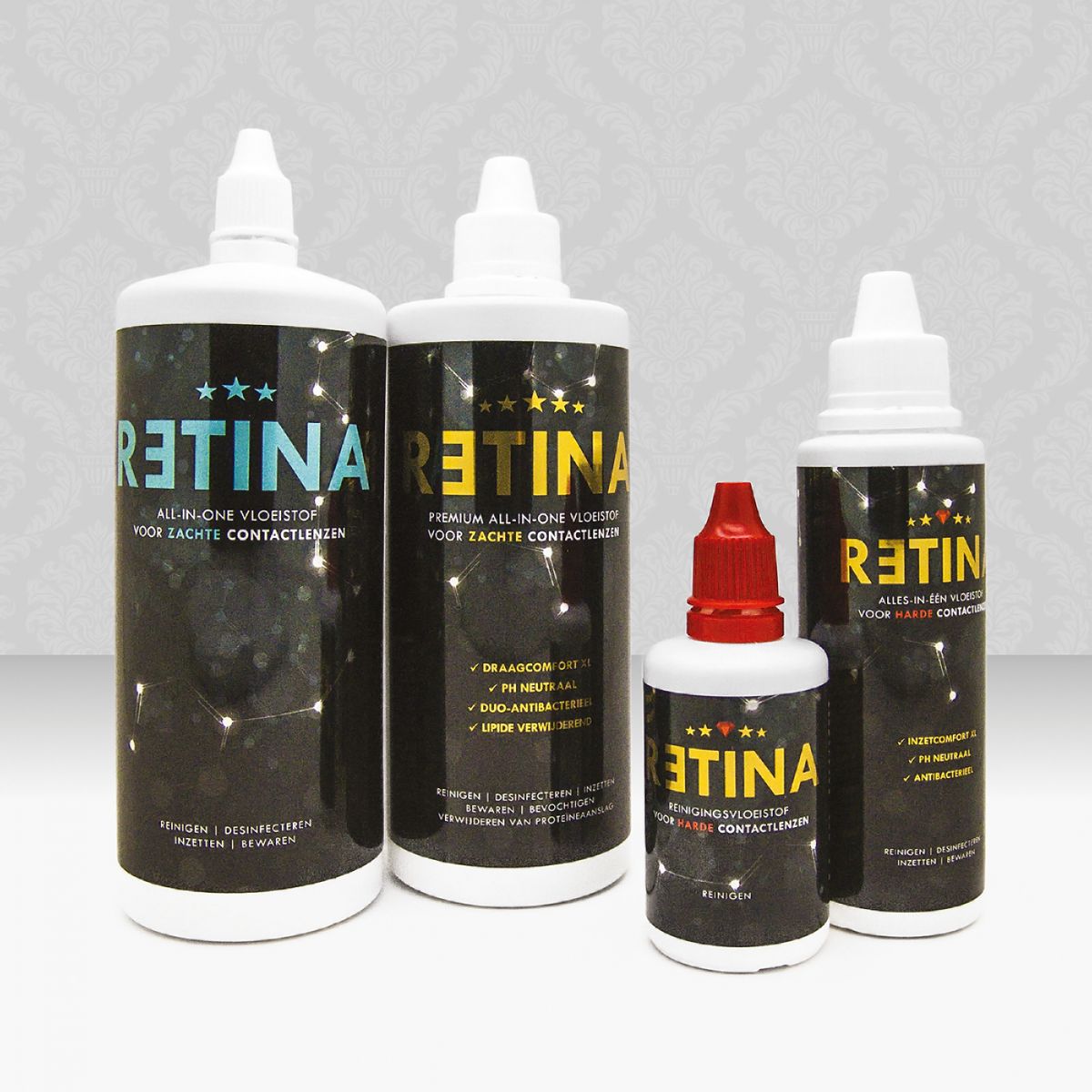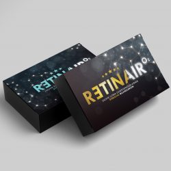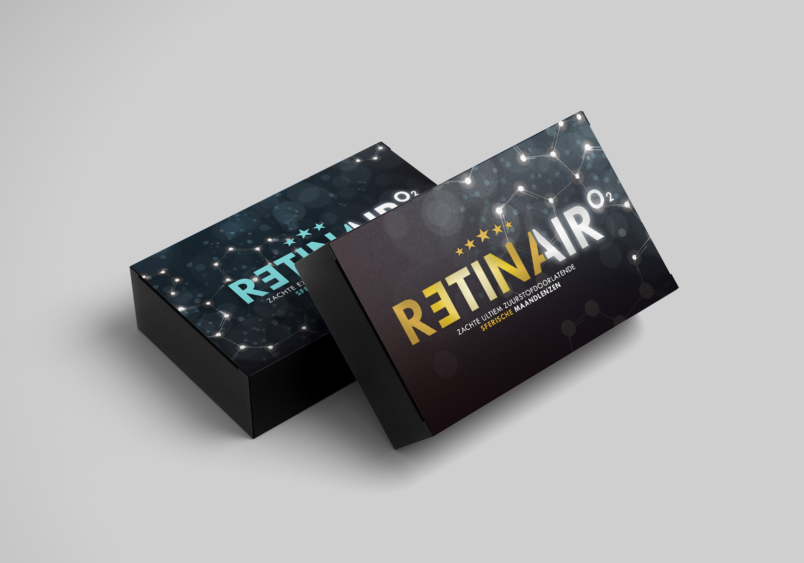Bril-in-Mode lanceert een eigen black label voor contactlenzen en lenzenvloeistoffen. De al voor het magazine bedachte naam RETINA had al goede naamsbekendheid en kon dus prima gebruikt worden voor de vloeistoffen. Om het extra zuurstofdoorlatende gehalte van de lenzen te benadrukken, ontwikkelden we bij lekker in vorm een toevoeging met bijbehorend logo: Retina Air O₂.