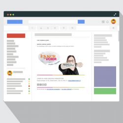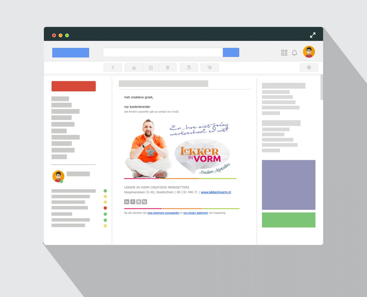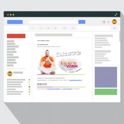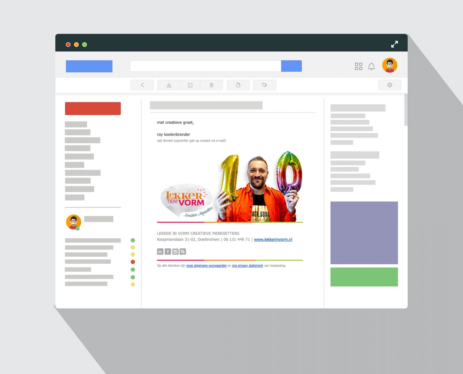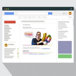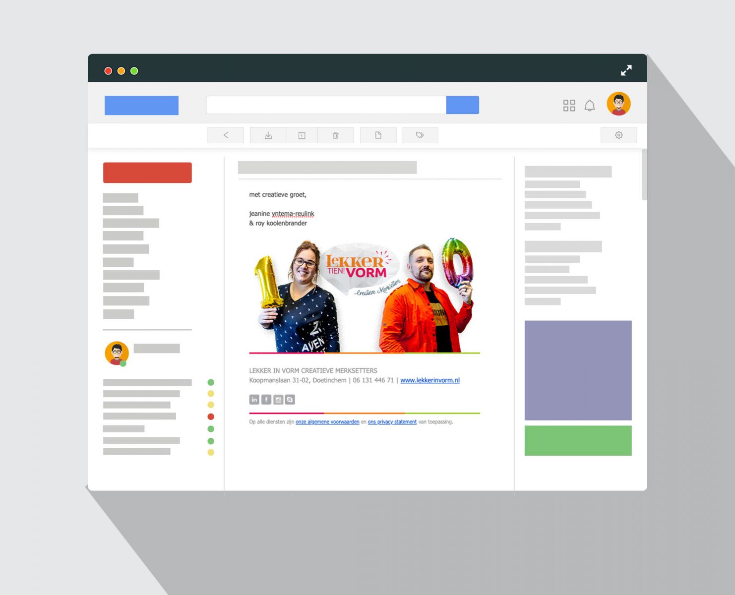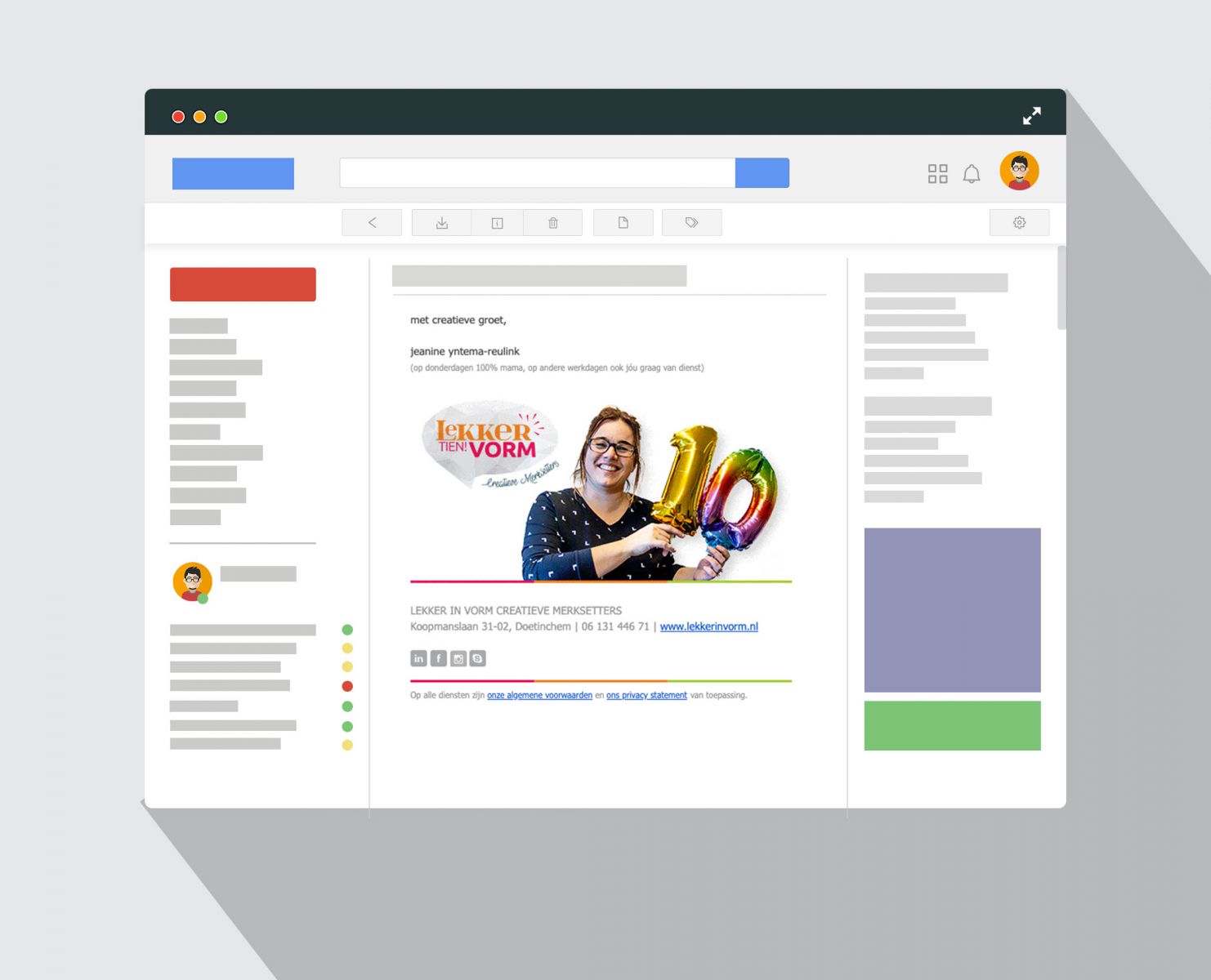 Een eenvoudige maar verzorgde e-mailhandtekening met foto past goed bij het persoonlijke karakter van ons bedrijf. Tijdens het jubileumjaar hebben de gewone versies tijdelijk plaatsgemaakt voor jubileumversies met geanimeerd jubileumlogo.