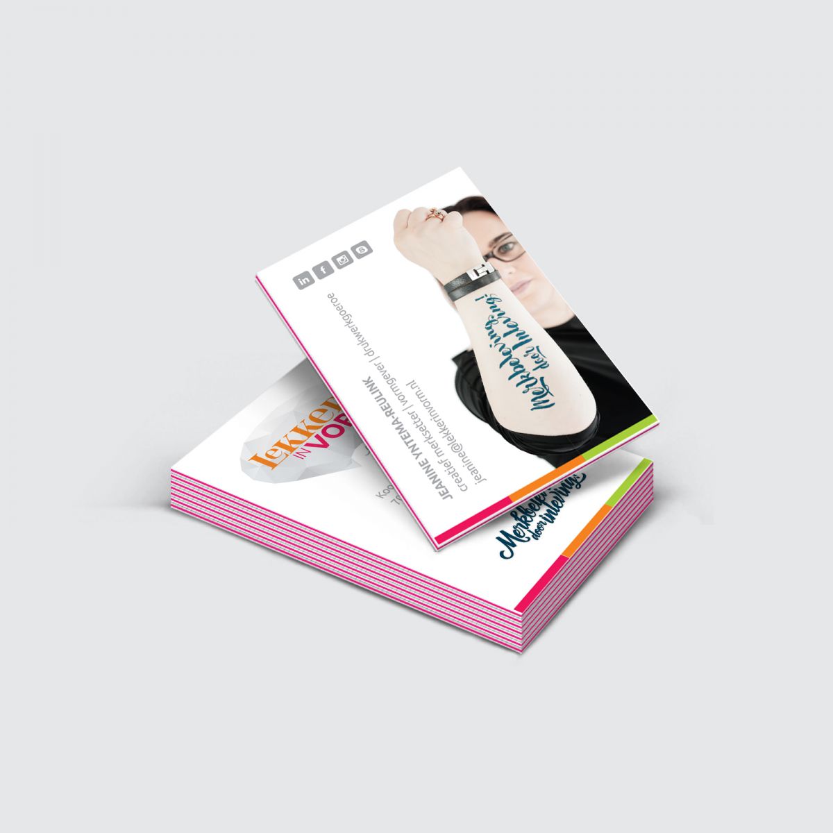 Dankzij een ontspannen fotoshoot met Madelon Tijdink beschikken we bij lekker in vorm weer over lekker actueel beeld van onszelf. Onder andere terug te vinden op onze visitekaartjes. We hebben qua uitvoering gekozen voor meerlaags multiloft papier: Jeanine’s kaartje heeft een roze tussenlaag en Roy’s kaartje een oranje tussenlaag.