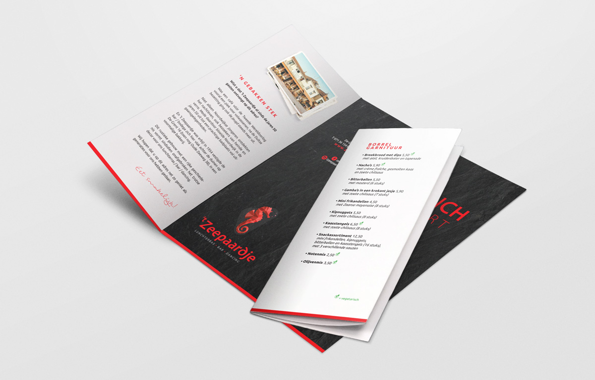 /in portfolio/door Roy KoolenbranderWeten wat je kunt eten op het lunchterras van ’t Zeepaardje in Noordwijk aan Zee? Je ontdekt het via de opgefriste menukaart! Niet alleen nieuwe gerechten, maar ook een lekker fris design. Terwijl je met een drankje wacht op de bestelling kun je zien wat er op dit adres allemaal heeft plaatsgevonden sinds de oprichting in de jaren 50!
