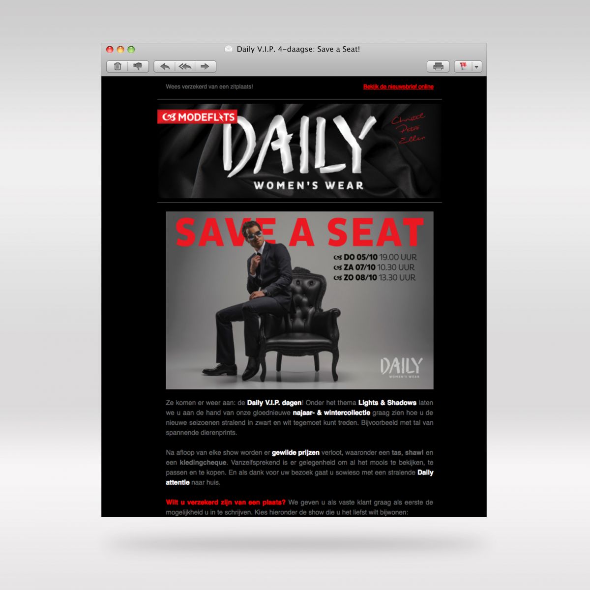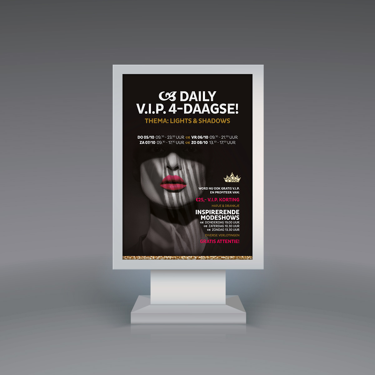 Nu de zon lager en lager komt te staan, kruipen de lange schaduwen langzaam maar zeker de Doetinchemse winkelstraatjes binnen. Gelukkig branden de lichten en de harten bij het altijd sfeervolle Daily women’s wear, de donkerste winkel van Doetinchem. lekker in vorm verzorgde binnen het thema ‘Lights & Shadows’ de ontwerpen en teksten voor de Daily V.I.P. dagen, in de vorm van een uitnodiging c.q. kortingskaart, een stoepbordposter en een digitale nieuwsbrief om alvast een plaats mee te reserveren.