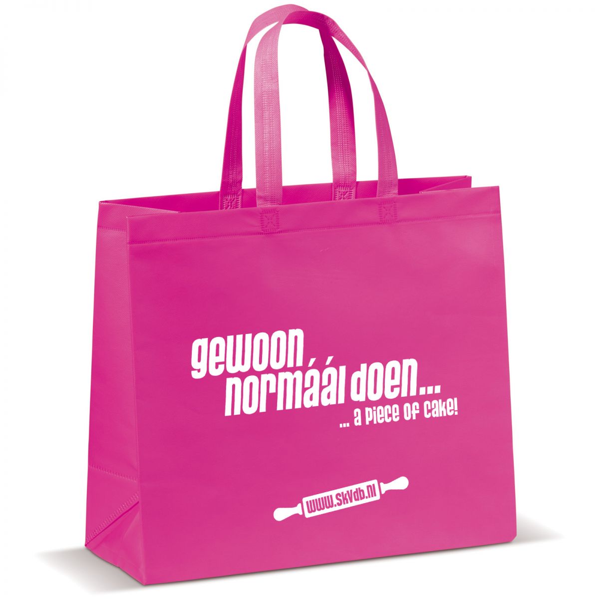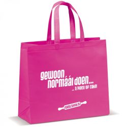 “Gewoon normáál doen… a piece of cake!” Dit is al jaren de leus van Stichting Komt voor de Bakker en ook de kerstgroet die ze mee wil geven aan kopers van haar kerstpakket vol lekkere koekjes. Daarom gaven wij vorm aan een kleurrijke non-woven tas waar je mee gezien mag worden. Handig materiaal, want het gaat meer dan één kerst mee. Met de inhoud is dat vast niet het geval!