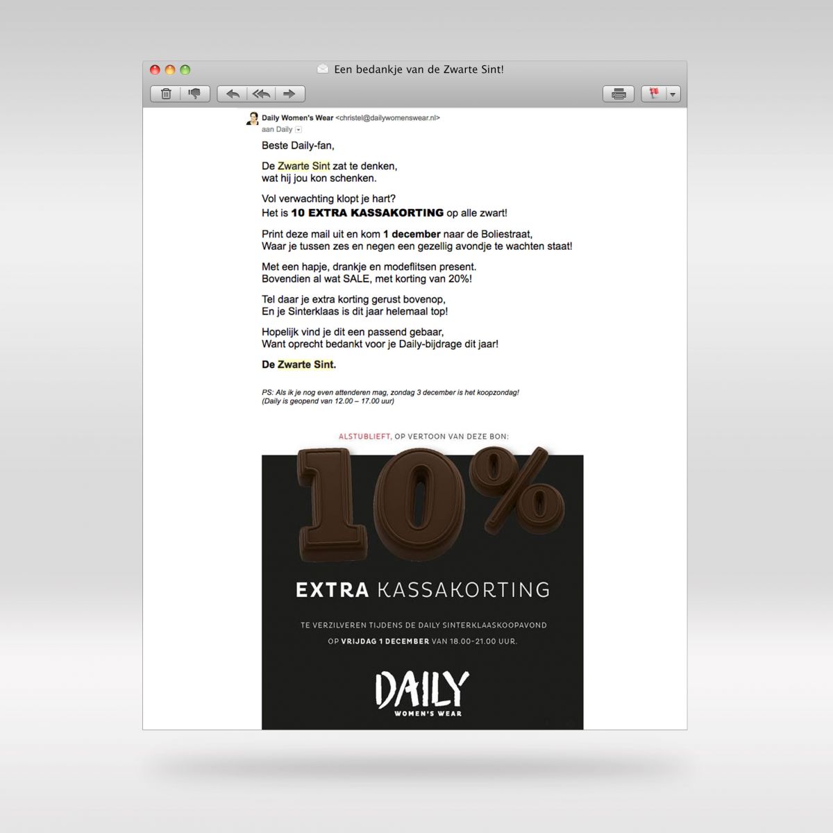 Bij lekker in vorm kunnen we niet alleen copywríten, maar ook copyríjmen. Deze gave kwam goed van pas bij de speciale Sinterklaas e-mail die Daily Women’s Wear graag wilde versturen als bedankje naar iedereen die afgelopen jaar een extra schoen had gezet voor de damesmodewinkel. Met de groetjes van de Zwarte Sint!