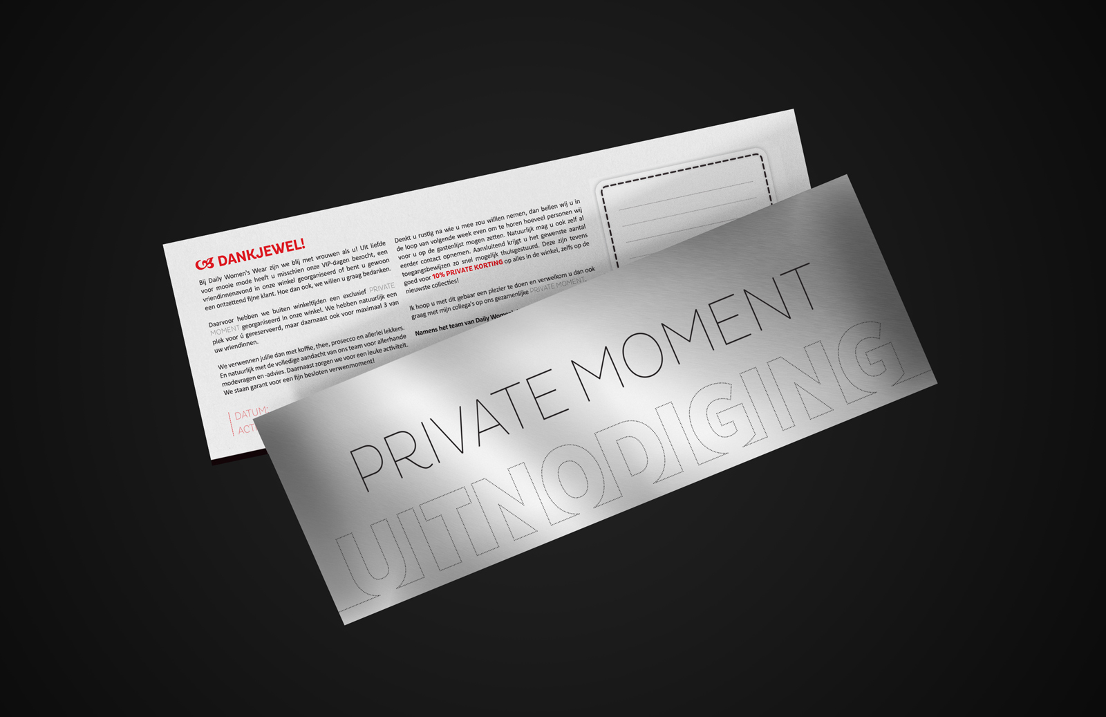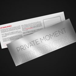 Om Daily Women’s Wear de mogelijkheid te bieden af en toe klanten uit te nodigen voor een exclusief besloten moment buiten de reguliere openingstijden, ontwikkelden we bij lekker in vorm het concept Private Moment. Uitgevoerd in een exclusieve uitnodiging op spiegelpapier en bijbehorende toegangspassen van stevig PVC. Beide items zijn voorzien van invulvelden, waardoor ze makkelijk door Daily Women’s Wear met de hand te personaliseren en te actualiseren zijn.