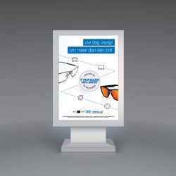 De reclamecampagne met de titel “Uw dag vraagt om meer dan één bril” loopt in lijn met de landelijke Essilor campagne en wordt onder de aandacht gebracht via onder andere een direct mailing naar vaste klanten en huis-aan-huis flyers met een opvallende kruisslag vouw. Deze mailingen worden ondersteund door diverse point-of-sale items in de winkel en op het web. Hierboven valt ook de bijbehorende reclamespot voor de regionale radio te beluisteren.