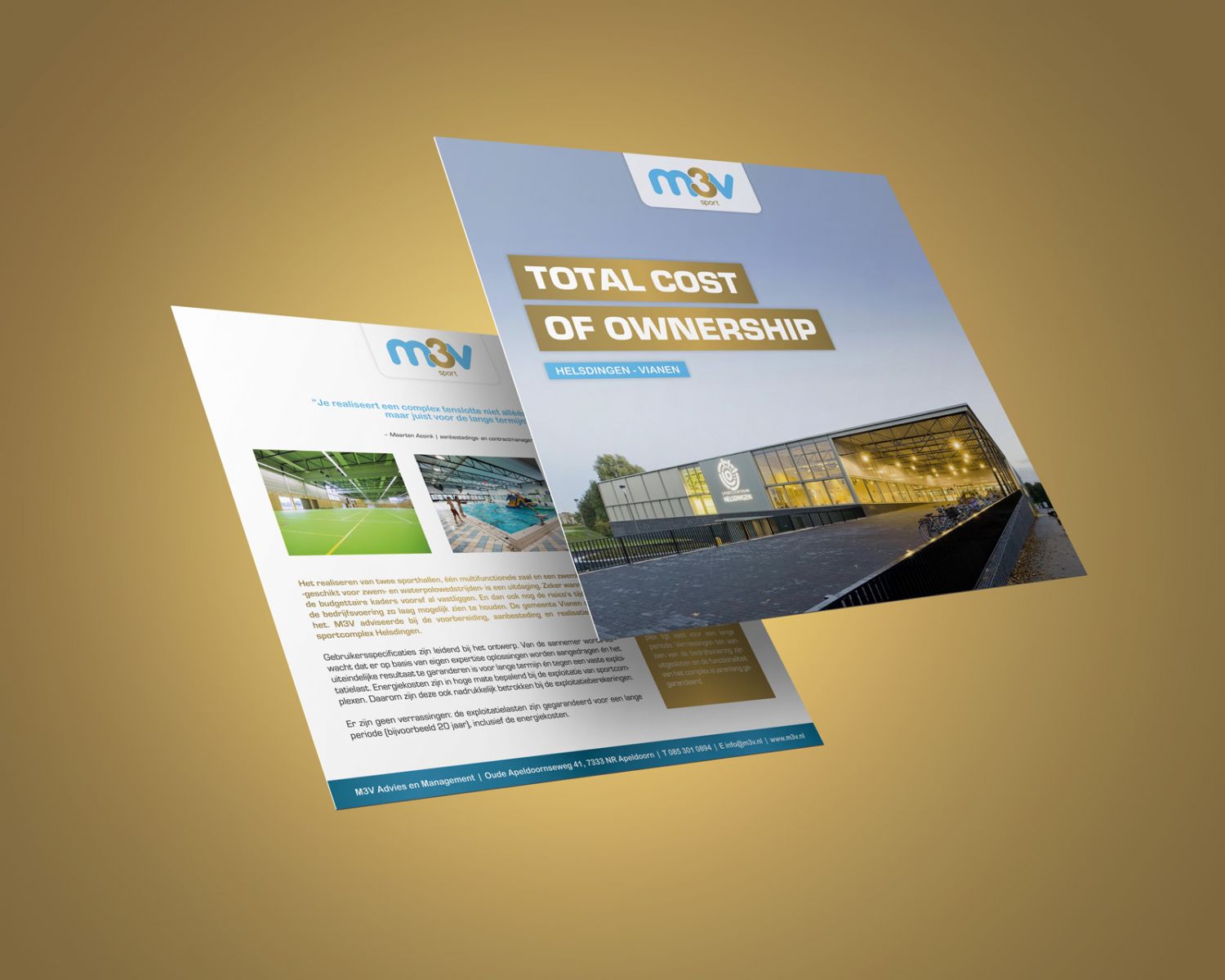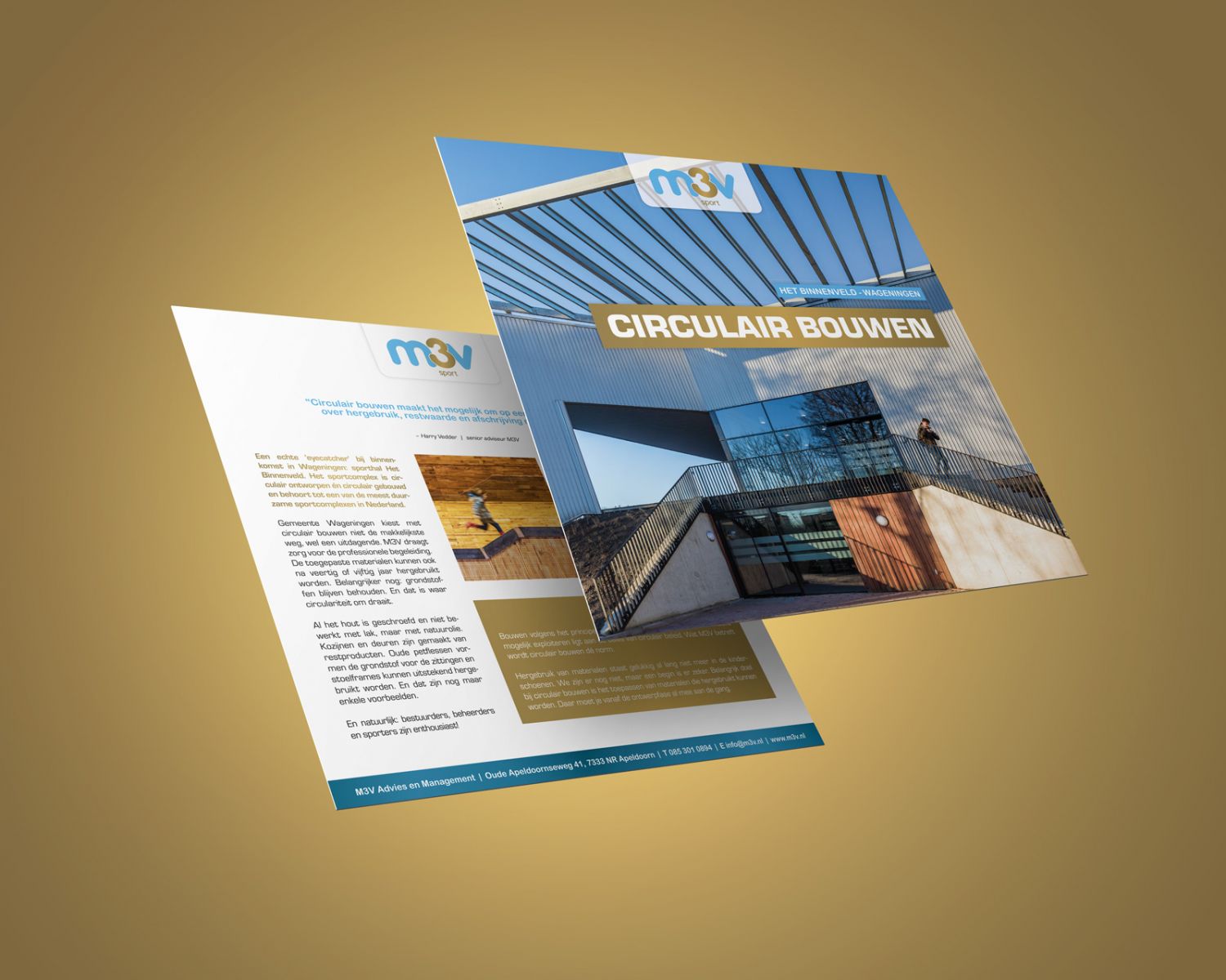 In deze vierkante flyer voor M3V sport wordt onder het motto “Haal eruit wat erin zit!” duidelijk gemaakt wat de meerwaarde van M3V kan zijn voor sportaccomodaties.