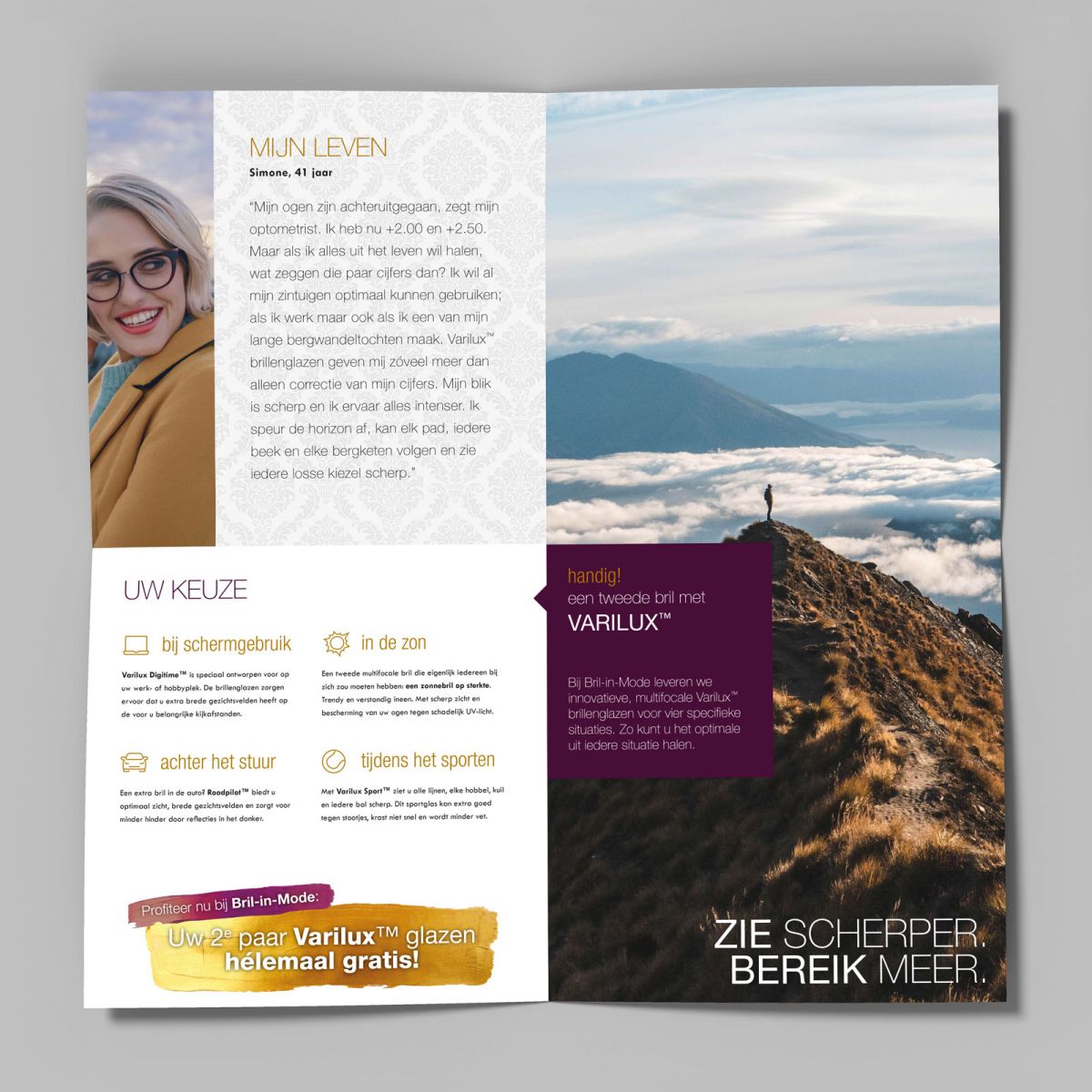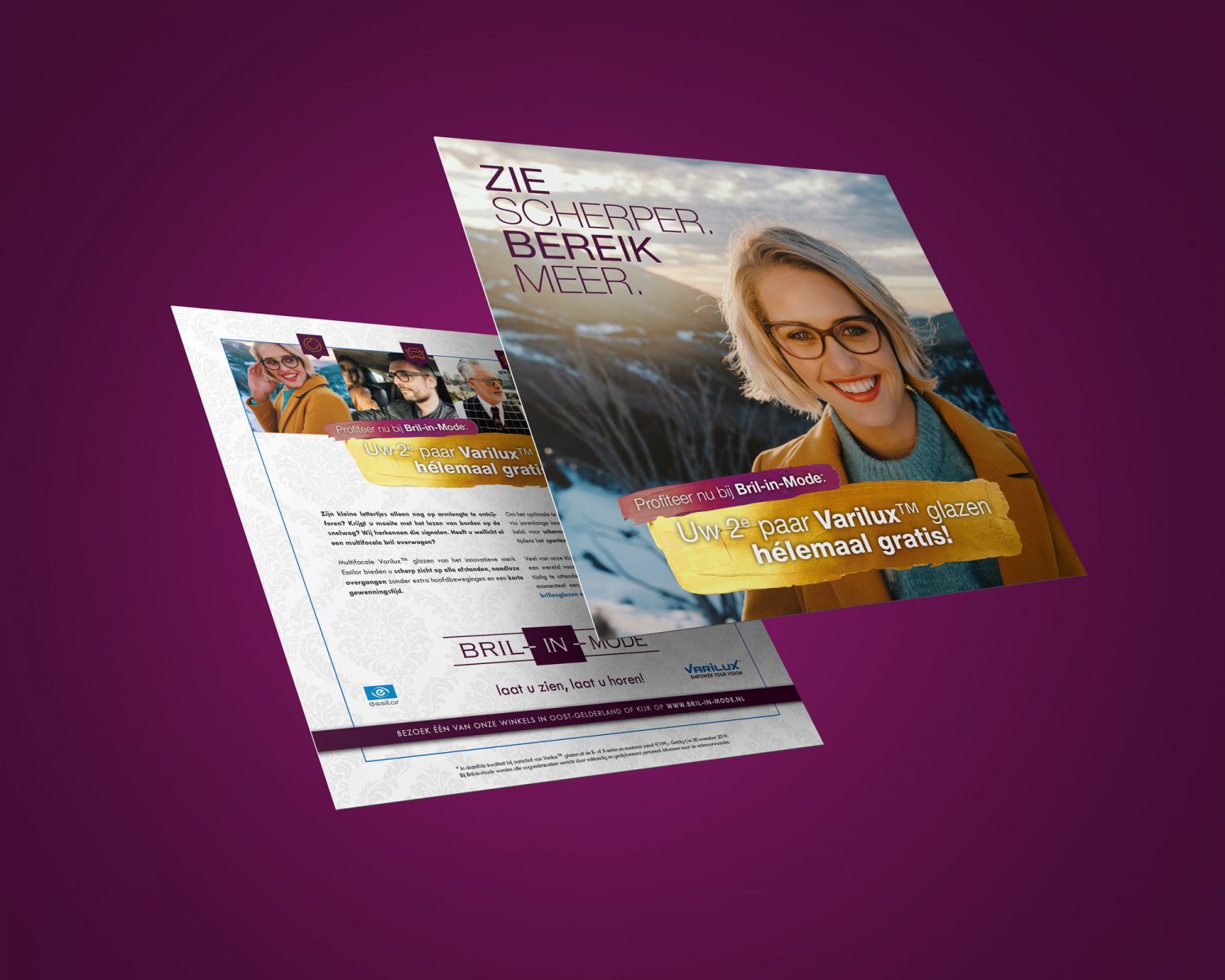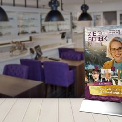 De reclamecampagne met de titel “Zie Scherper, Bereik Meer” loopt in lijn met de landelijke Essilor campagne en wordt onder de aandacht gebracht via onder andere een direct mailing naar vaste klanten en huis-aan-huis flyers met een opvallende kruisslag vouw. Deze mailingen worden ondersteund door diverse point-of-sale items in de winkel en op het web. Hierboven valt ook de bijbehorende reclamespot voor de regionale radio te beluisteren.