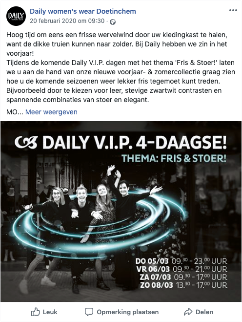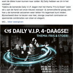 Hoog tijd om eens een frisse wervelwind door je kledingkast te halen, want de dikke truien kunnen naar zolder. Bij Daily hebben ze zin in het voorjaar! Tijdens de komende Daily V.I.P. dagen met het thema ‘Fris & Stoer!’ laten het team je graag zien hoe je de komende seizoenen lekker fris tegemoet kunt treden. Bijvoorbeeld door te kiezen voor leer, stevige zwartwit contrasten en spannende combinaties van stoer en elegant.