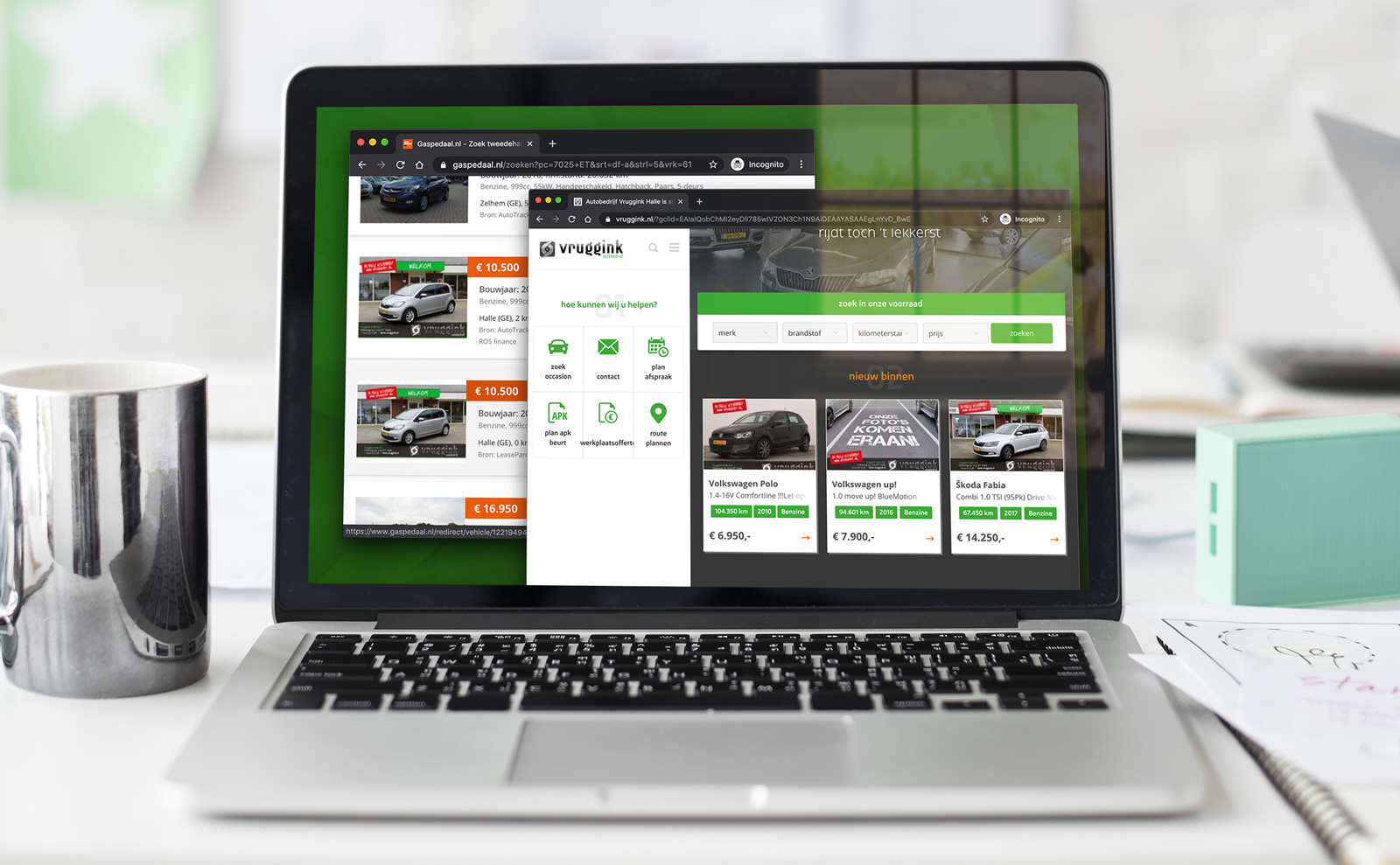 Bij lekker in vorm hebben we voor Autobedrijf Vruggink diverse fotosjablonen ontworpen, die het team makkelijk en snel zelf als statusupdates op fotos van auto’s kan plaatsen. Deze worden zowel getoond op de eigen website als op bijvoorbeeld Gaspedaal.nl.