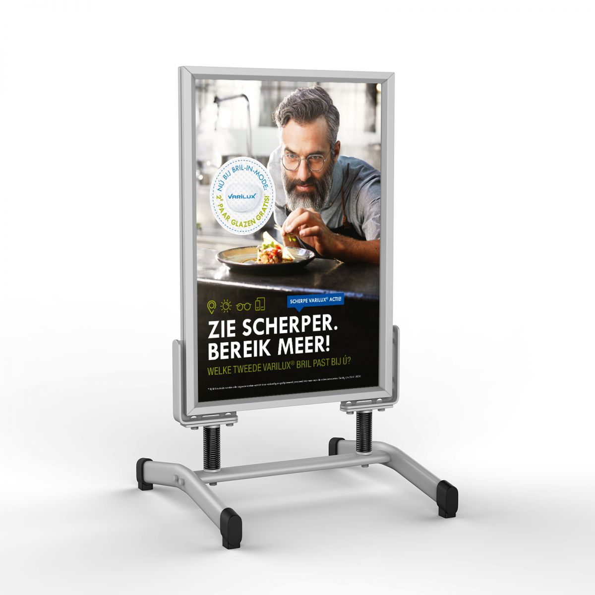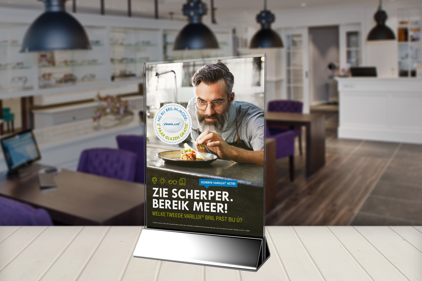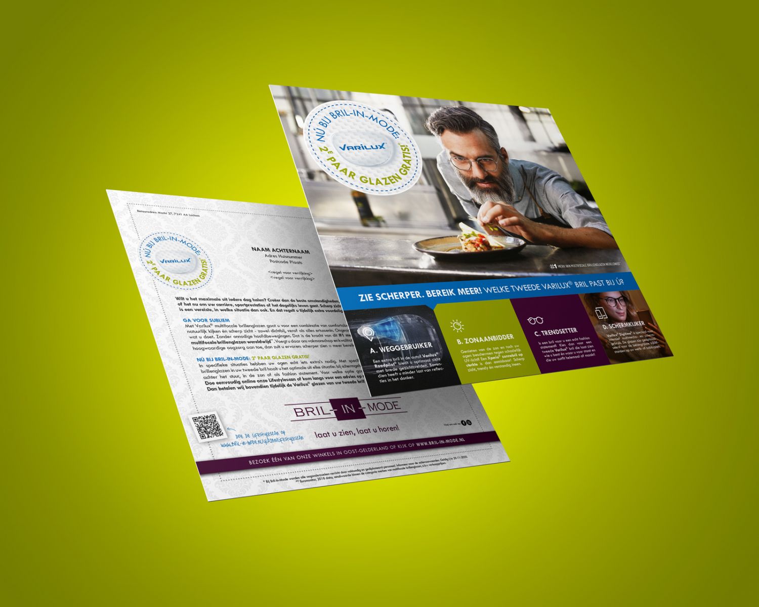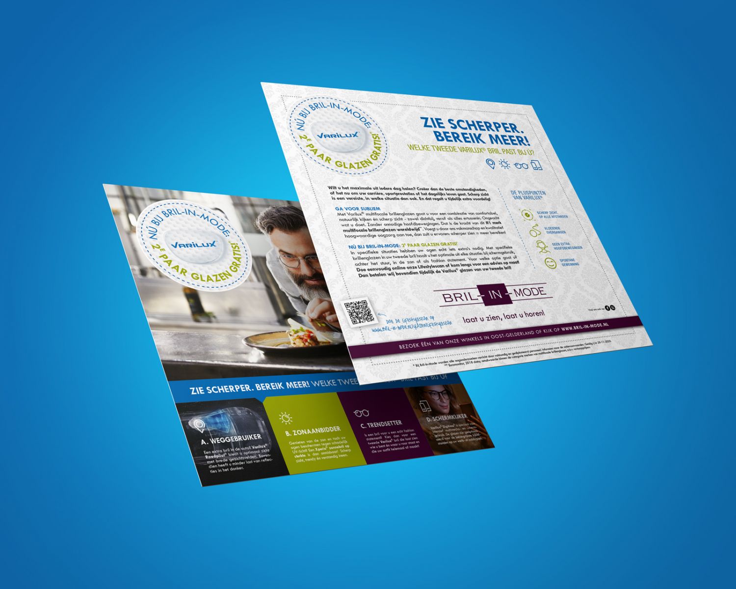 Bij lekker in vorm ontwierpen we deze actiematige Varilux campagne, bestaande uit een direct mailingkaart, huis-aan-huis flyer en diverse items in en rondom de winkel en online.