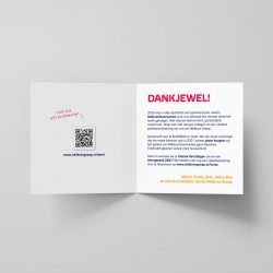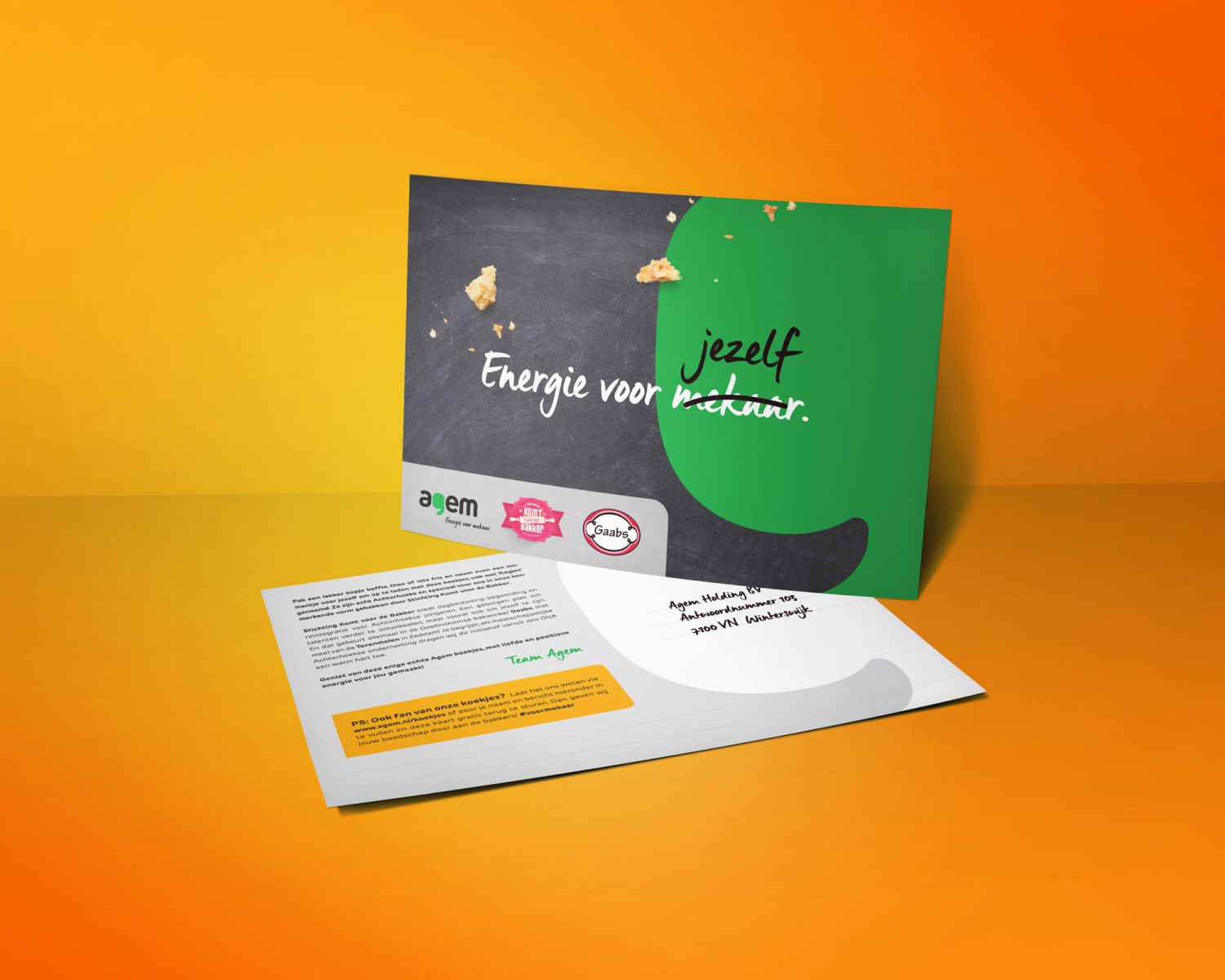 Speciaal voor Agem bakt Stichting Komt voor de Bakker bij Gaabs koekjes in de vorm van het kenmerkende Aagje. Bij lekker in vorm mochten we voor het versturen ervan een begeleidende kaart ontwerpen en schrijven in een leuke mix van beide huisstijlen. De kenmerkende koekkruimels van Gaabs mochten hierbij natuurlijk niet ontbreken.