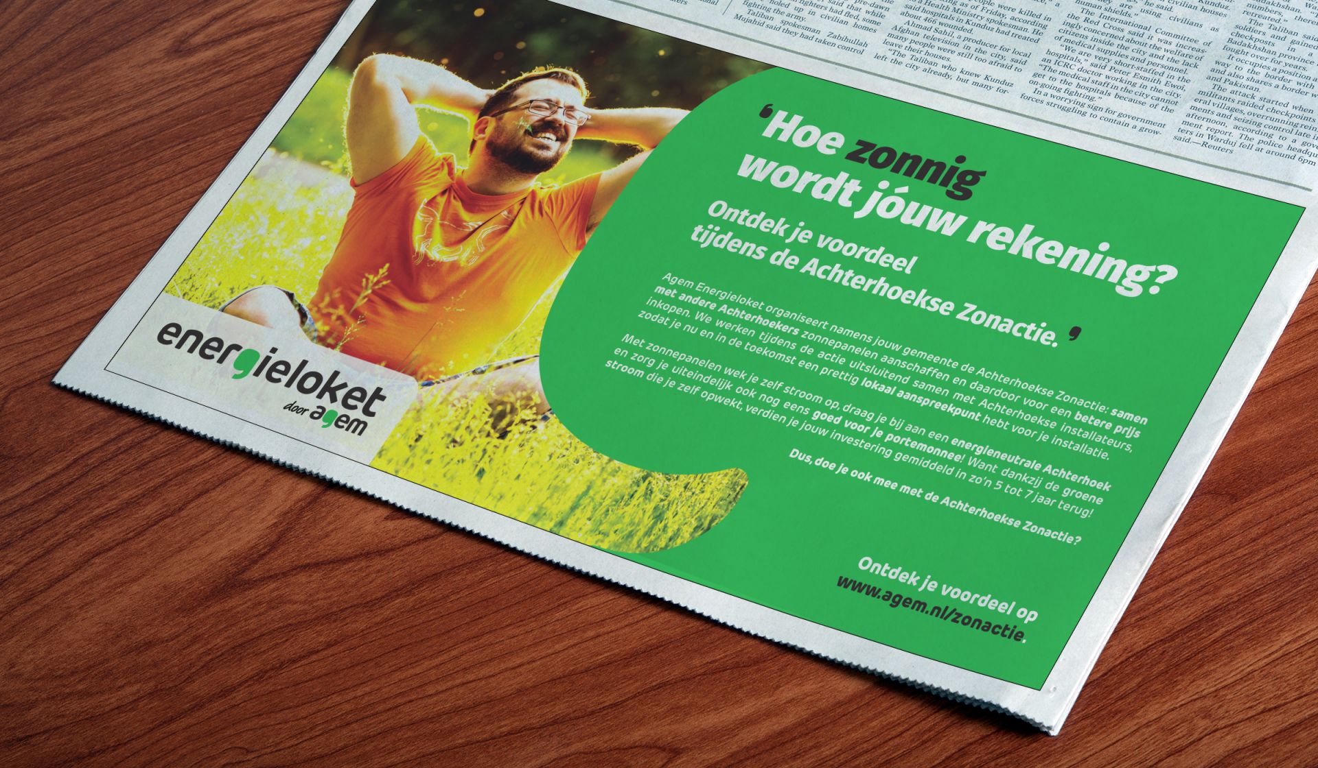Namens diverse Achterhoekse gemeentes organiseert Agem Energieloket de Achterhoekse Zonactie: samen met andere Achterhoekers zonnepanelen aanschaffen en daardoor voor een betere prijs inkopen. Bij lekker in vorm mochten we qua tekst en beeld meehelpen aan de realisatie van de bijbehorende campagne, onder andere bestaande uit een informatiebrochure, een advertentie en outdoor posters.