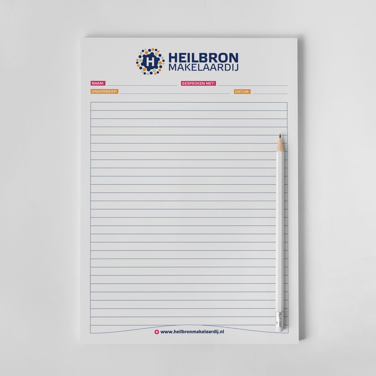 De introductie van een aangepast logo is ook het ideale moment om de bijbehorende huisstijldragers onder de loep te nemen. Bij lekker in vorm ontwierpen we daarom voor Heilbron & Heilbron Makelaardij nieuwe visitekaartjes, briefpapier (om zelf te printen via facturatiesoftware) en enveloppen in uniforme stijl.