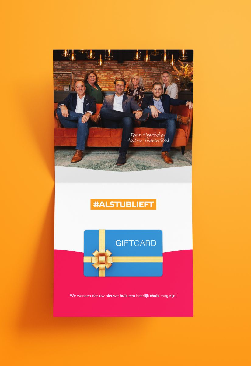 Is het afsluiten van je hypotheek gelukt? Dan doet team Hypotheken van Heilbron je graag een giftcard cadeau om je te feliciteren. Bij lekker in vorm mochten we hier een feestelijke kaart voor ontwerpen. Het geheel is gedrukt op metallic papier met een bijpassende sprankelende envelop.