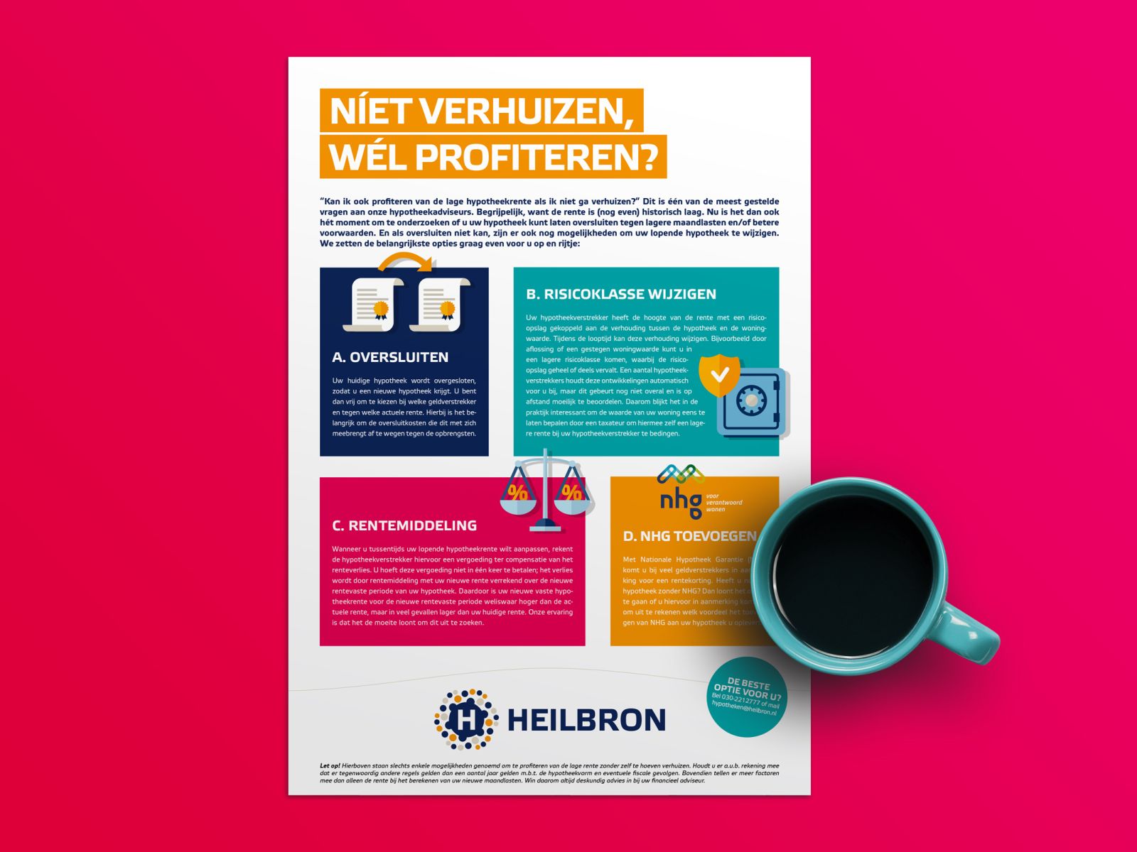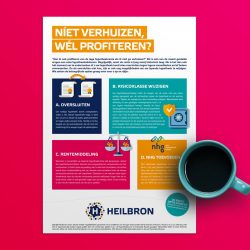 Wist je dat je als huiseigenaar ook kunt profiteren van de lage hypotheekrente zonder te verhuizen? Er zijn verschillende mogelijkheden die Heilbron in een infosheet overzichtelijk voor klanten op een rijtje heeft gezet. Voor alle vermelde opties is het van belang om de waarde van de woning goed te kennen. Daarom biedt Heilbron in samenwerking met diverse regionale makelaars graag een gratis waardebepaling aan die je als klant via de bijgevoegde waardecheque kunnen verzilveren.