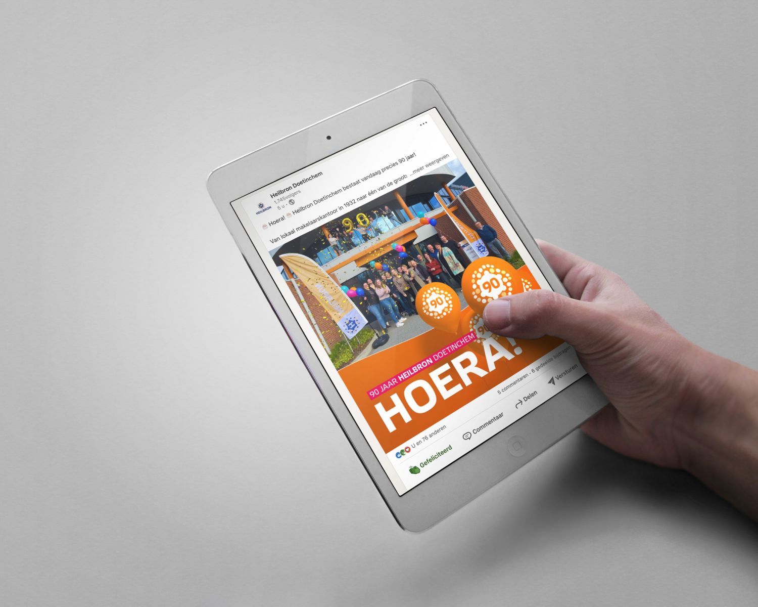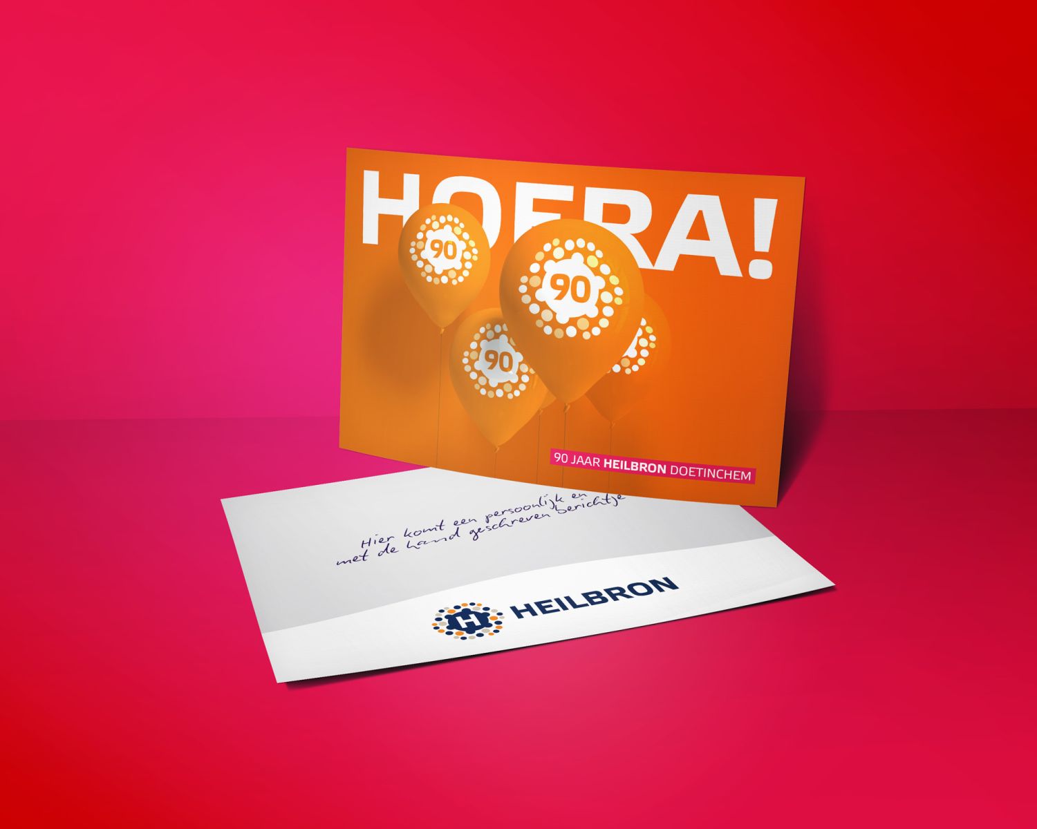 Heilbron Doetinchem bestaat maar liefst 90 jaar en dat mag natuurlijk niet ongemerkt voorbijgaan! Bij lekker in vorm mochten we deze feestelijke gelegenheid aankleden met diverse items, waaronder een begeleidende kaart voor jubileumpresentjes, cakeprints en diverse digitale items voor social media en een personeelsfeest bij Amphion.
