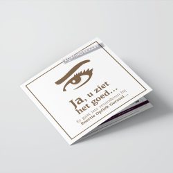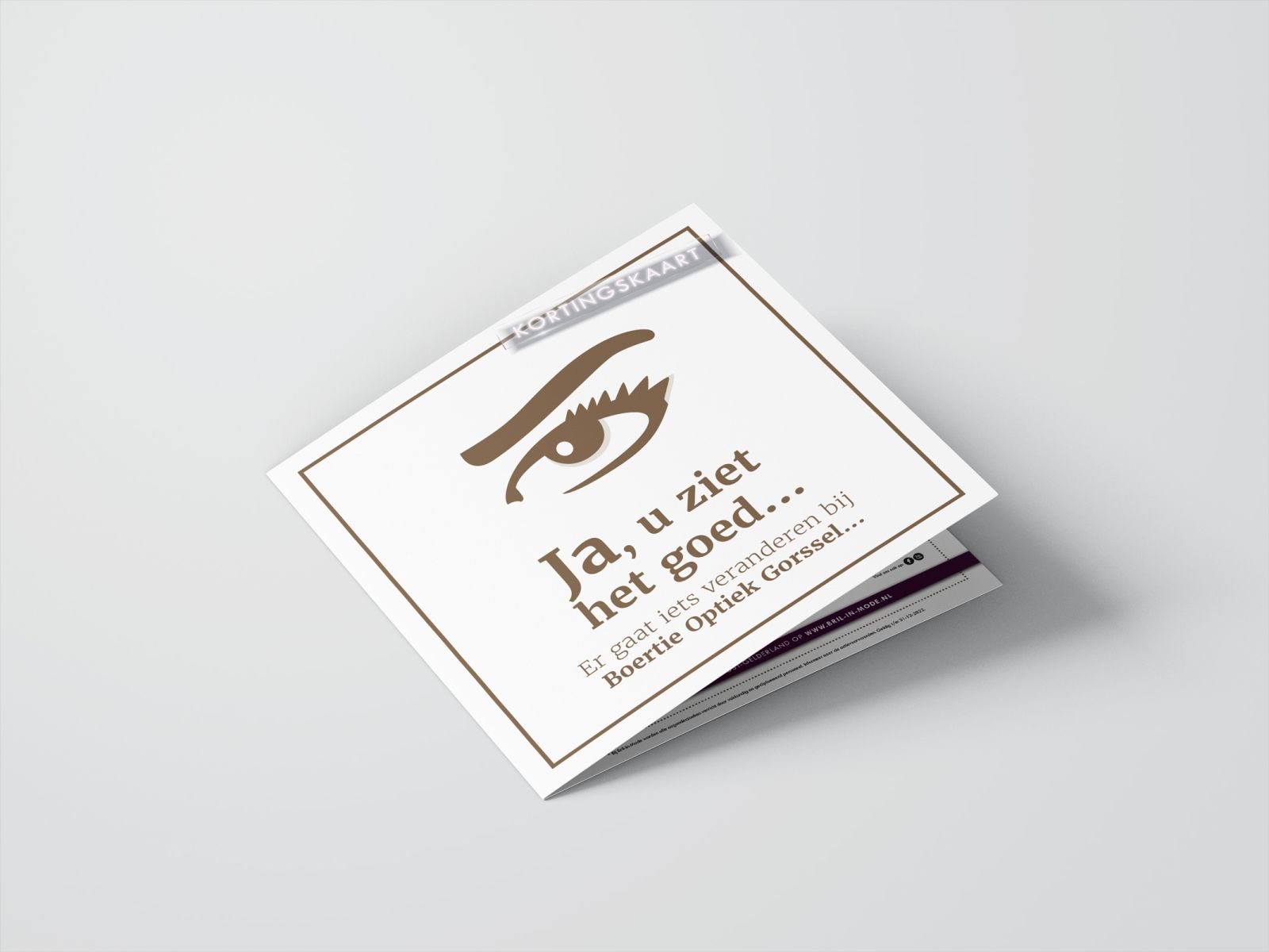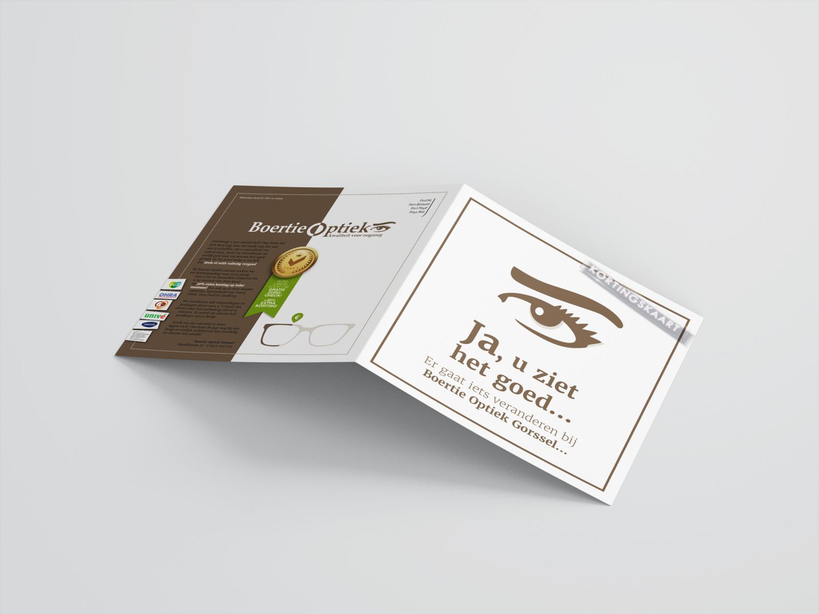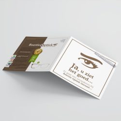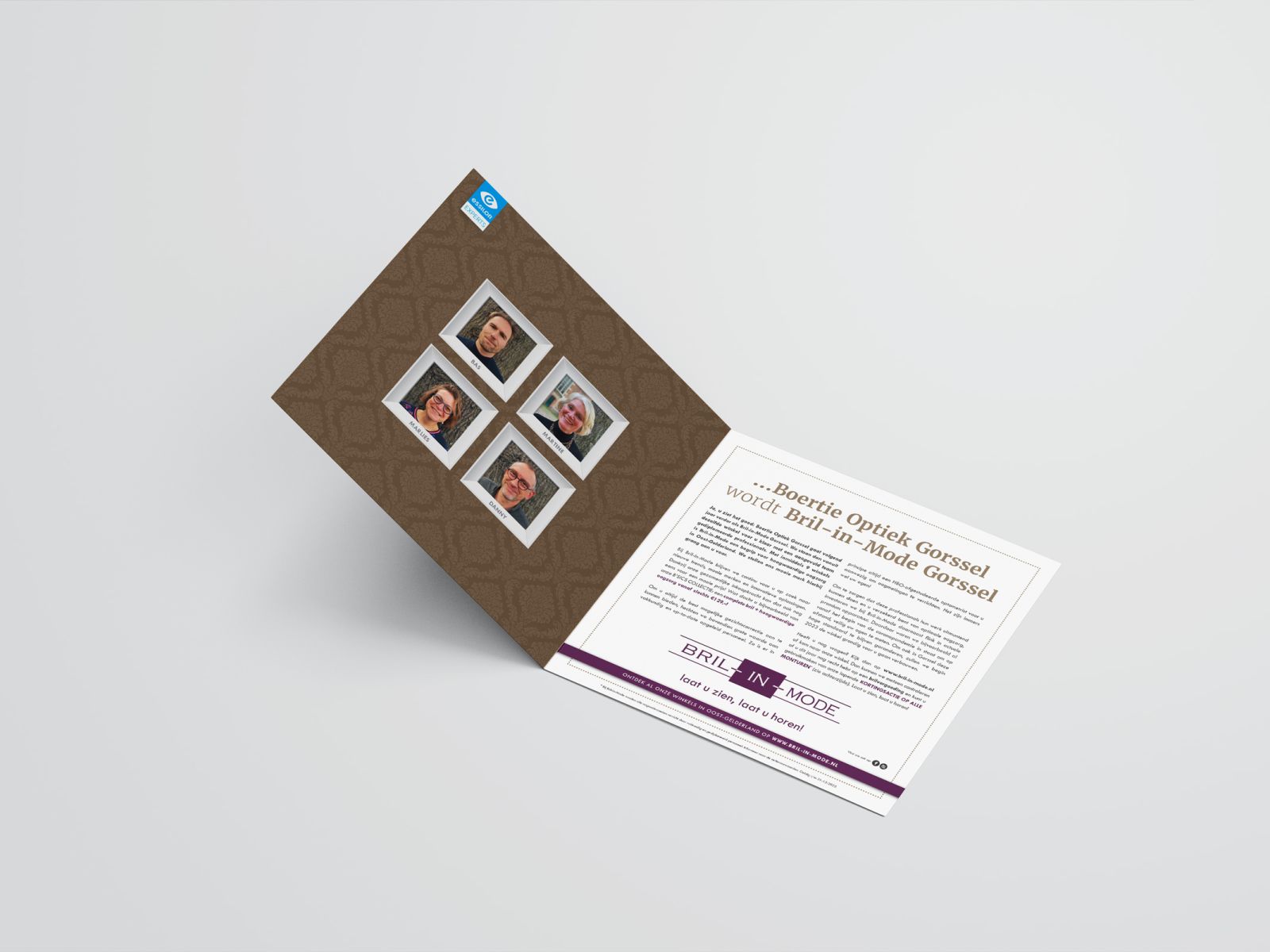 Boertie Optiek Gorssel gaat vanaf volgend jaar verder onder de vlag van Bril-in-Mode. Om vaste klanten hiervan op de hoogte te brengen, ontwierpen we bij lekker in vorm een dubbele direct mailingkaart met sluitsticker. De buitenzijde maakten we op in voor de klant herkenbare Boertie Optiek huisstijl met een fijne kortingsactie. De binnenzijde introduceert het merk Bril-in-Mode in tekst en beeld. Daarnaast ontwikkelden we een stoepbordposter om ook voorbijgangers in Gorssel op de hoogte te stellen. Alvast welkom bij de groep, Bril-in-Mode Gorssel!