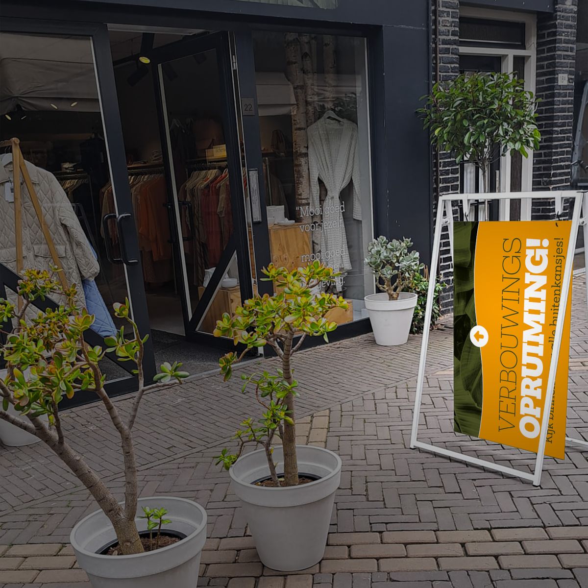 Struin! gaat zich klaarmaken voor een winkel 2.0. Voor het verbouwen willen eigenaresses Mirte & Hadassa nog even flink knallen om de winkel zo leeg mogelijk te krijgen. Bij lekker in vorm mochten we hiervoor een opvallende raamsticker en stoepbordposter ontwerpen.