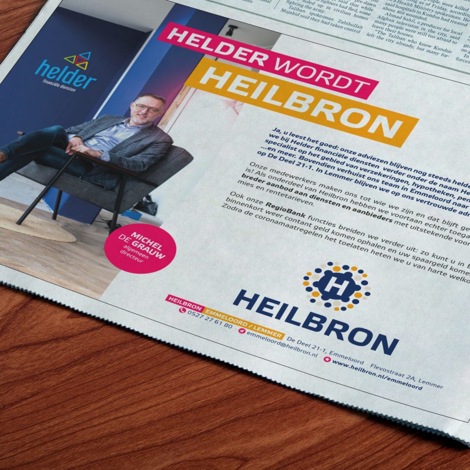 Helder financiële diensten uit Emmeloord en Lemmer gaat verder onder de naam Heilbron. Dit mag natuurlijk niet ongemerkt voorbij gaan. Bij lekker in vorm ontwierpen we een passende advertentie voor in lokale media, waarin de transitie wordt toegelicht.