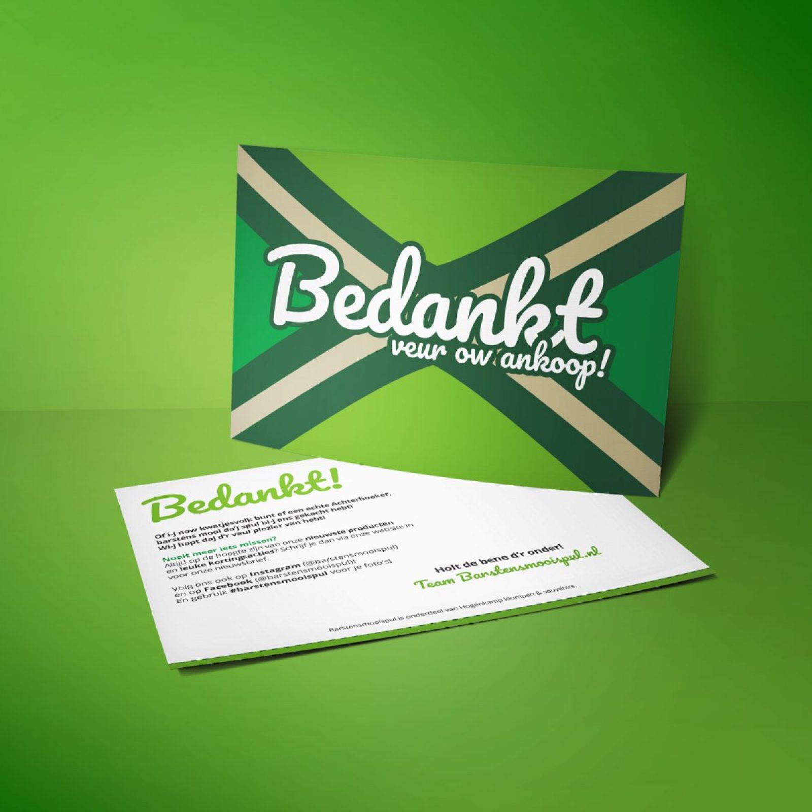 Om klanten te bedanken voor hun aankoop bij Barstensmooispul! stuurt Hogenkamp Klompen & Souvenirs deze bedankkaart mee bij de bestellingen. Bij lekker in vorm mochten we hem vormgeven en onze copywriter Roy mocht er zelfs zijn Achterhoekse roots voor aanspreken.
