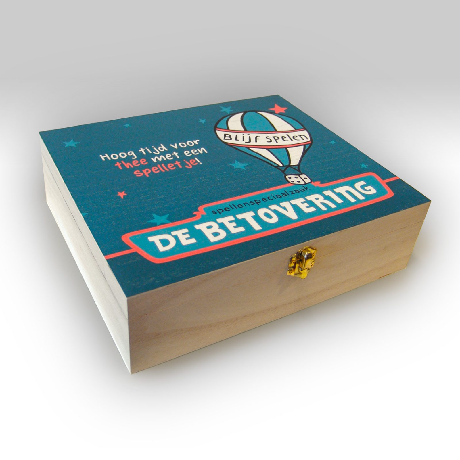 Hoog tijd voor thee met een spelletje! Omdat de dames van Spellenspeciaalzaak de Betovering gek zijn op thee, verzonnen we bij lekker in vorm deze volledig binnen de huisstijl bedrukte houten theedoos als cadeau voor de opening van hun nieuwe winkel.