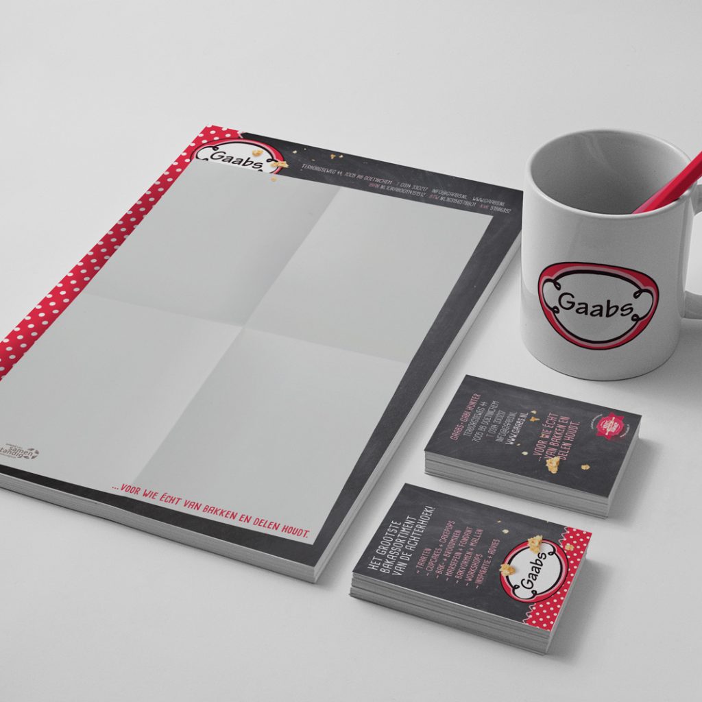 Briefpapier mag meer doen dan alleen de inhoud van je brief of factuur vertellen, zeker als je een bakwinkel hebt. Daarom ontwierp lekker in vorm smaakmakend briefpapier en bijpassende visitekaartjes voor Gaabs in Doetinchem. Er moest een oplossing gevonden worden voor de leesbaarheid van het briefpapier, omdat de huisstijl normaalgesproken een krijtbord-achtergrond heeft. Dit is uiteindelijk gelukt door een ouderwets receptvelletje er digitaal bovenop te plaatsen.