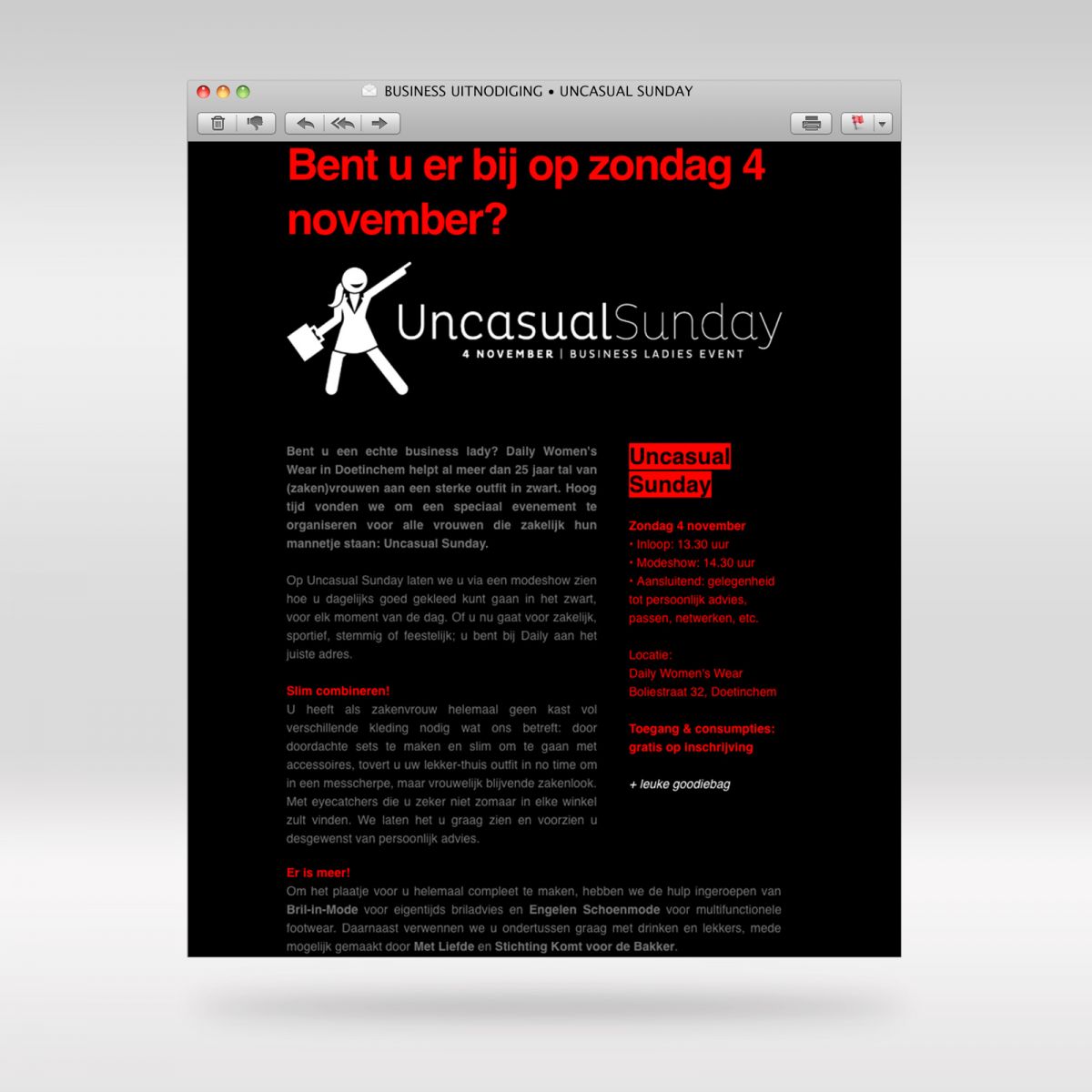 Daily Women’s Wear in Doetinchem helpt al meer dan 25 jaar tal van (zaken)vrouwen aan een sterke outfit in zwart. Hoog tijd vonden we om een speciaal evenement te organiseren voor alle vrouwen die zakelijk hun mannetje staan: Uncasual Sunday. Op Uncasual Sunday laten we u via een modeshow zien hoe u dagelijks goed gekleed kunt gaan in het zwart, voor elk moment van de dag. Of u nu gaat voor zakelijk, sportief, stemmig of feestelijk; u bent bij Daily aan het juiste adres. Slim combineren! U heeft als zakenvrouw helemaal geen kast vol verschillende kleding nodig wat ons betreft: door doordachte sets te maken en slim om te gaan met accessoires, tovert u uw lekker-thuis outfit in no time om in een messcherpe, maar vrouwelijk blijvende zakenlook. Met eyecatchers die u zeker niet zomaar in elke winkel zult vinden. We laten het u graag zien en voorzien u desgewenst van persoonlijk advies. Er is meer! Om het plaatje voor u helemaal compleet te maken, hebben we de hulp ingeroepen van Bril-in-Mode voor eigentijds briladvies en Engelen Schoenmode voor multifunctionele footwear. Daarnaast verwennen we u ondertussen graag met drinken en lekkers, mede mogelijk gemaakt door Met Liefde en Stichting Komt voor de Bakker. Oh, neem vooral ook uw visitekaartje mee. We hebben de professionele merksetters van ons reclamebureau Lekker in Vorm bereid gevonden visitekaartjes te komen lezen. Uw visitekaartje zegt namelijke meer dan u soms denkt! Dus business lady, zien we u zondag 4 november? De toegang tot Uncasual Sunday is gratis, maar het aantal zitplaatsen is beperkt. Schrijf u daarom nu alvast in!