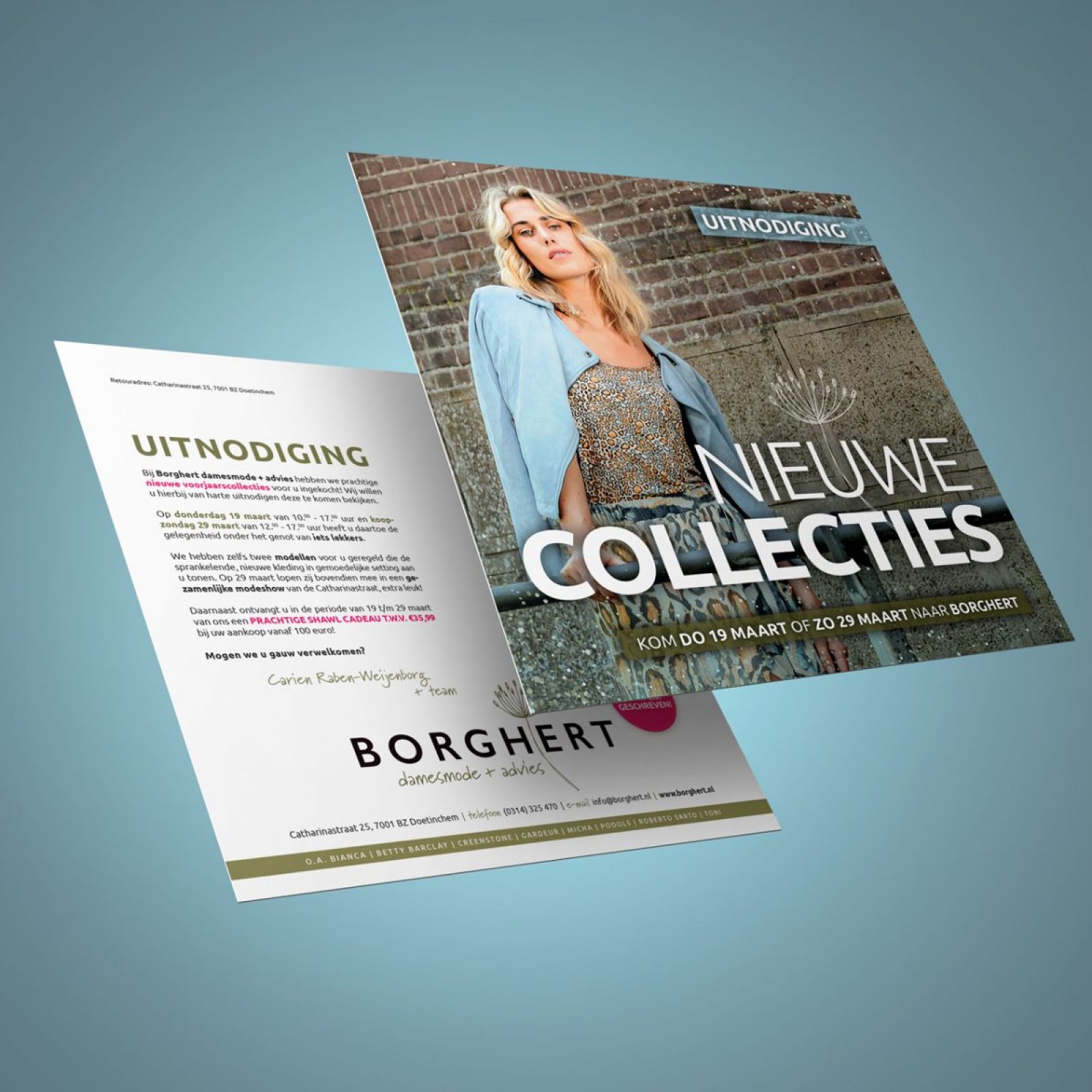 Borghert damesmode + advies heeft prachtige nieuwe voorjaarscollecties ingekocht. Om iedereen te enthousiasmeren deze te komen bekijken, mochten we bij lekker in vorm een sfeervolle campagne ontwikkelen in de vorm van een uitnodiging via direct mail en facebook, een advertentie in de Doetinchemmer en een stoepbordposter in de winkelstraat.
