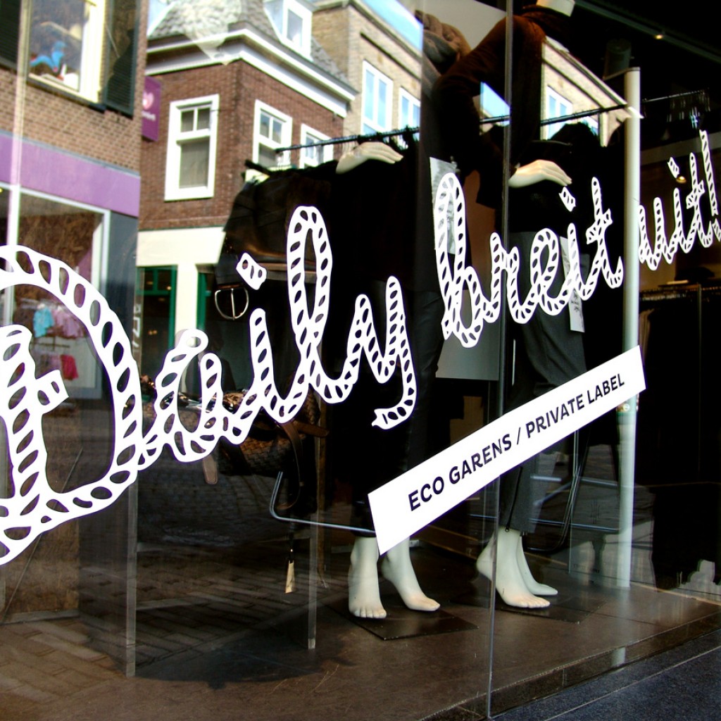 Daily gaat binnenkort een private label collectie voeren met duurzame ecogarens. Om hiervoor ruimte te maken organiseert Daily eerst een uitverkoop van haar zomercollectie. lekker in vorm ontwierp diverse saleproducten met de titel ‘Daily breit uit!’. De advertentie, raambelettering, posters en advertorial zijn deels informerend, deels actiematig.