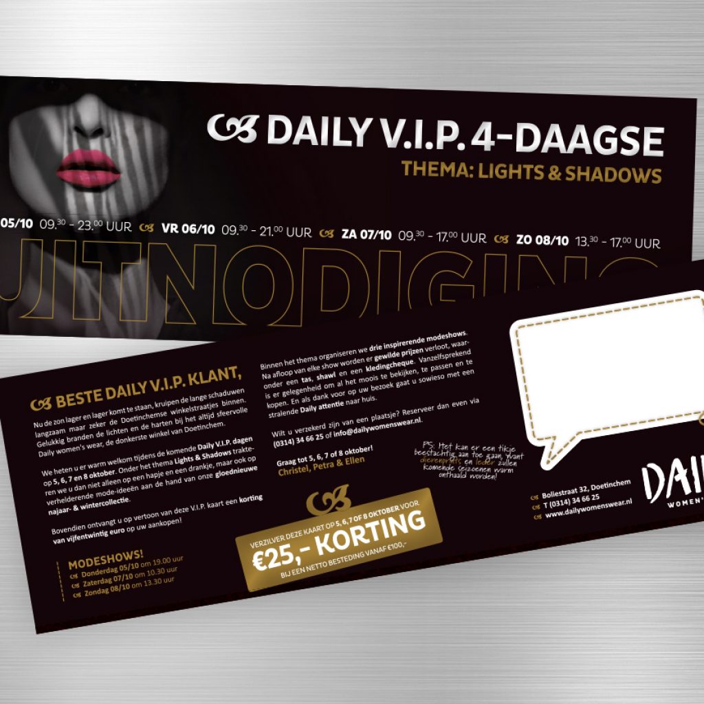 Nu de zon lager en lager komt te staan, kruipen de lange schaduwen langzaam maar zeker de Doetinchemse winkelstraatjes binnen. Gelukkig branden de lichten en de harten bij het altijd sfeervolle Daily women’s wear, de donkerste winkel van Doetinchem. lekker in vorm verzorgde binnen het thema ‘Lights & Shadows’ de ontwerpen en teksten voor de Daily V.I.P. dagen, in de vorm van een uitnodiging c.q. kortingskaart, een stoepbordposter en een digitale nieuwsbrief om alvast een plaats mee te reserveren.