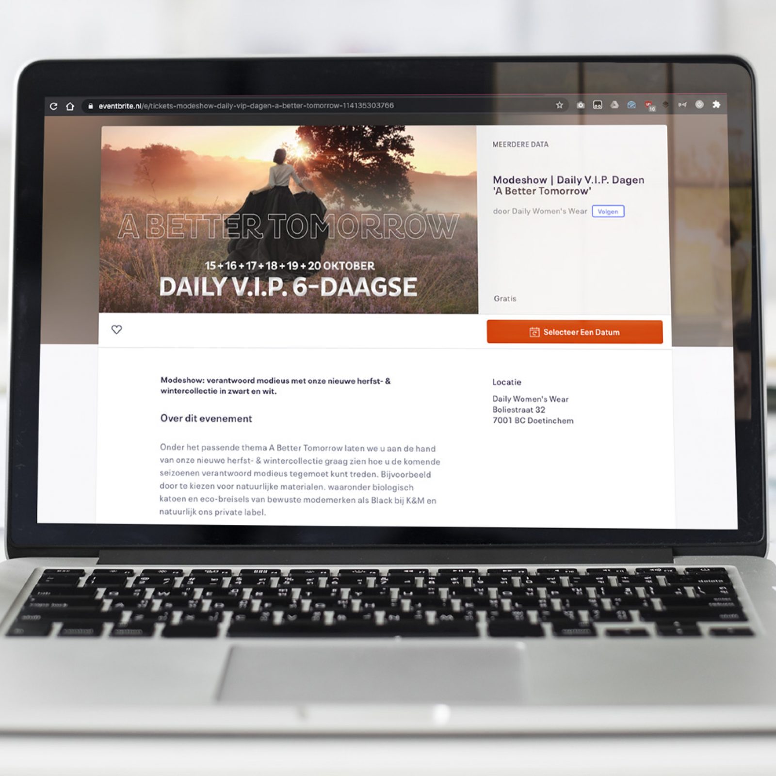 Om de aangepaste V.I.P. dagen met hun vele modeshows en aangescherpte coronaregels in juiste banen te leiden, mochten we bij lekker in vorm het online gratis ticketysteem Eventbrite inrichten voor Daily Women’s Wear. De beschikbaarheid van elke modeshow is hier voor klanten makkelijk online inzichtelijk gemaakt en de gratis kaartjes met QR-code kunnen zonder tussenkomst van de winkel aangeschaft worden. Bovendien staan de bezoekersgegevens meteen goed geregistreerd volgens de huidige richtlijnen. De eventpagina hebben we tot slot mooi aangekleed met duidelijke teksten en sfeerbeeld en gepromoot via een nieuwsbrief, de website van Daily zelf en social media.