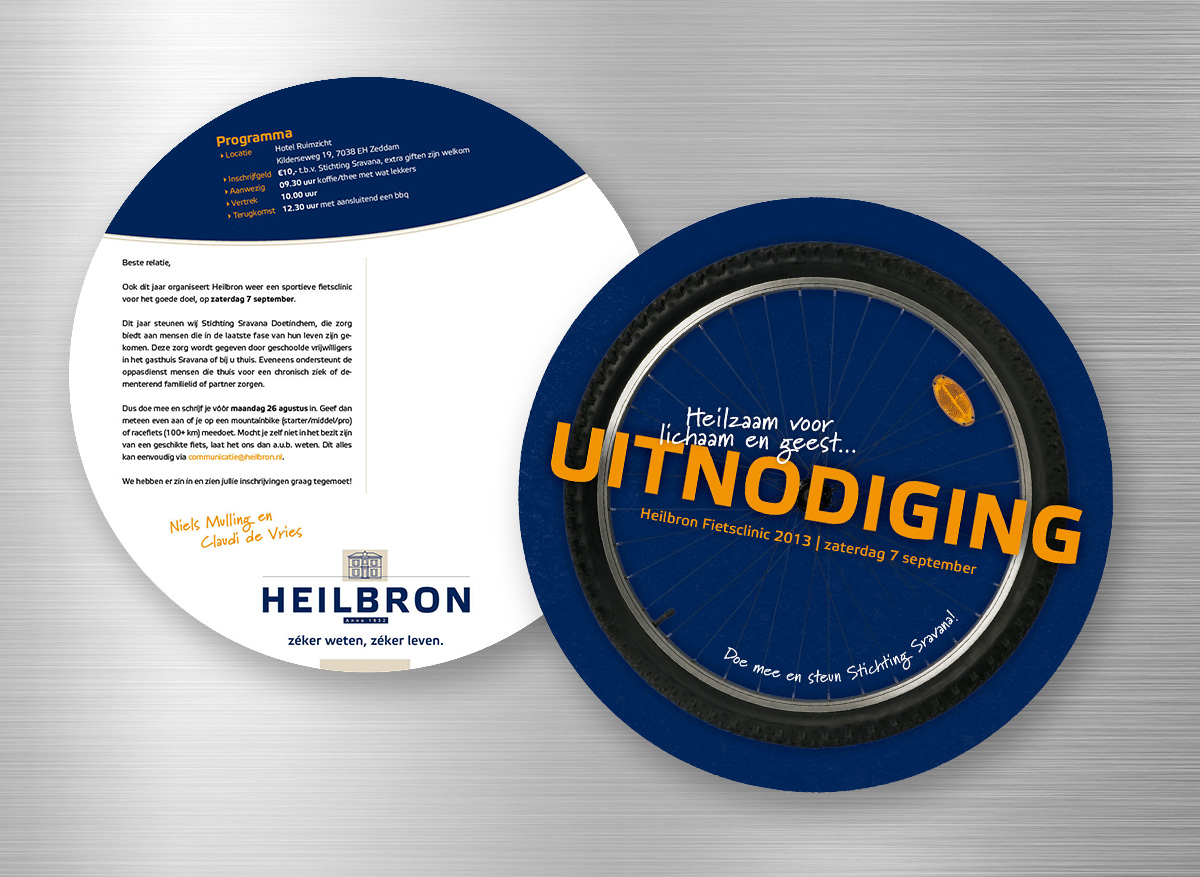 De Heilbron Fietsclinic is inmiddels een begrip in de regio: klanten en medewerkers zetten zich samen sportief in voor een goed doel. Voor 2013 is dat doel Stichting Sravana. lekker in vorm ontwierp een eigenzinnig ronde uitnodiging en overige campagneelementen, waaronder een passende give-away.