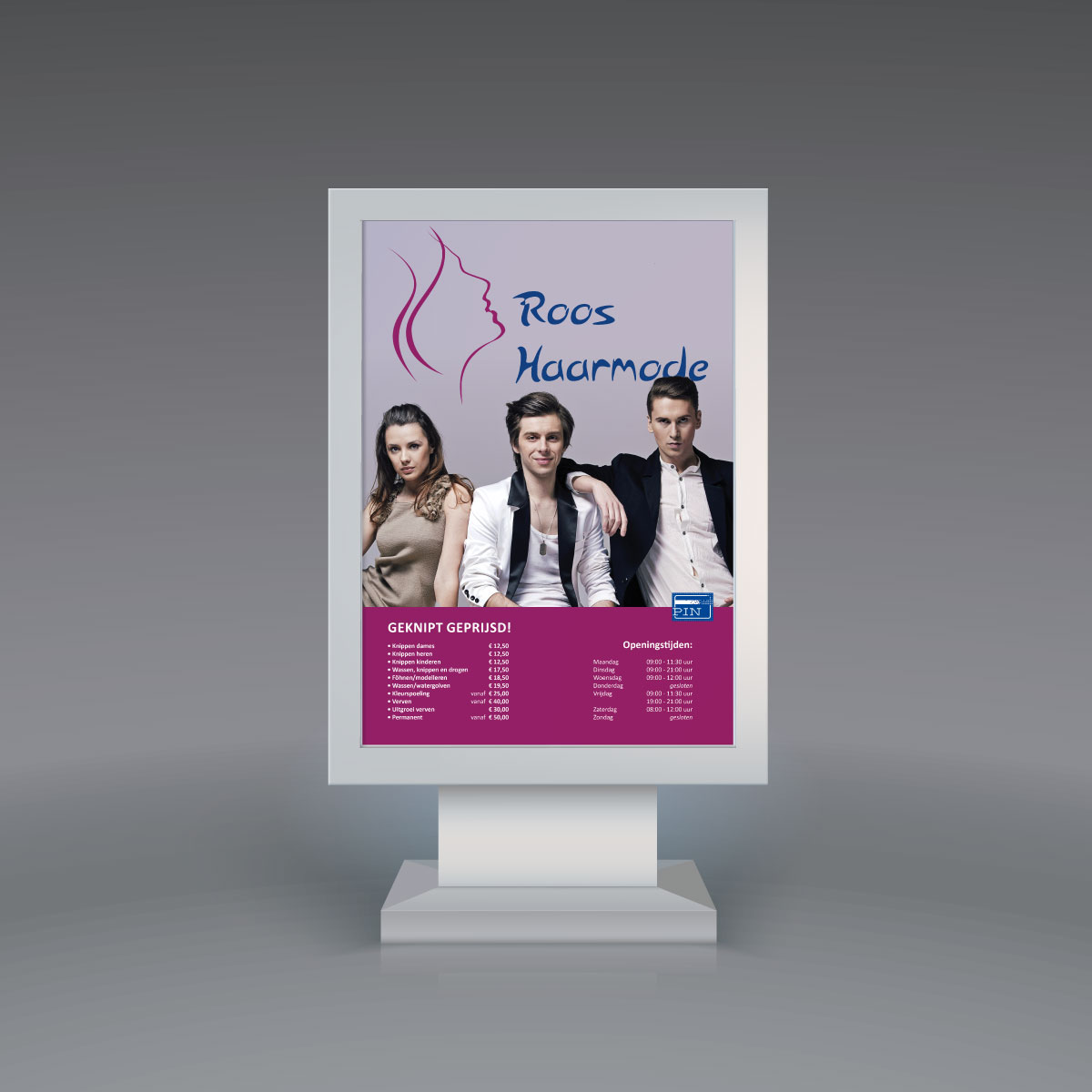 Nieuw in Doetinchem: Roos Haarmode. lekker in vorm ontwierp binnen de bestaande huisstijl een eenvoudige maar professionele flyer en een bijpassend stoepbord.