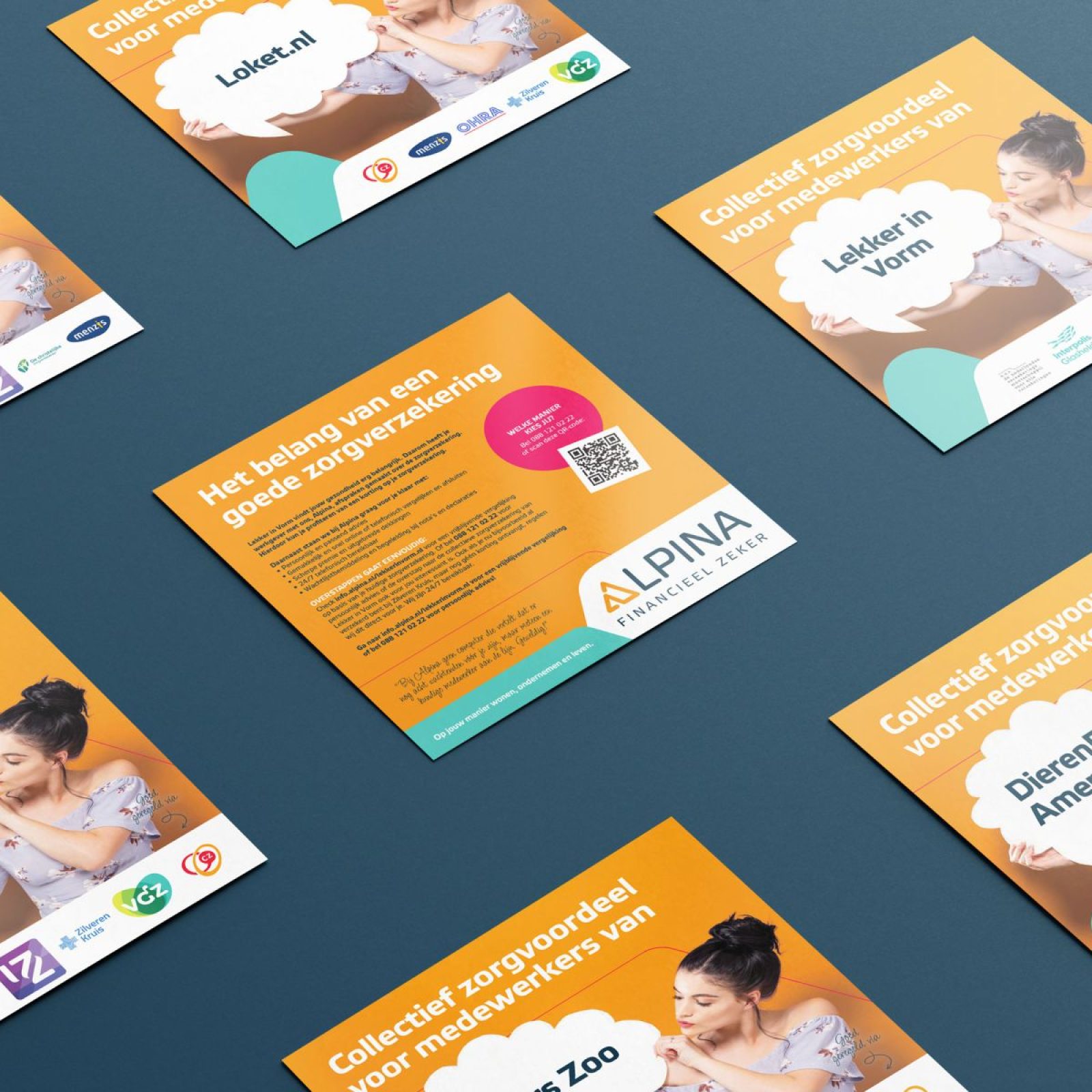 Alpina maakt met veel werkgevers afspraken voor een collectieve zorgverzekering, waardoor medewerkers van een aantrekkelijke korting kunnen profiteren. Om hen hiervan op de hoogte te stellen, mochten we bij lekker in vorm een flyer ontwikkelen en daarna per werkgever personaliseren met hun eigen bedrijfsnaam, QR-code en gelinkte zorgverzekeraars.