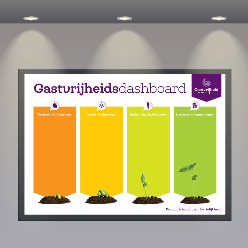 Met het vernieuwde gastvrijheidsdashboard van Gastvrijheid in Bedrijf kunnen teamleden elkaar stimuleren hun service uit te breiden. lekker in vorm ontwierp de poster in de nieuwe huisstijl.
