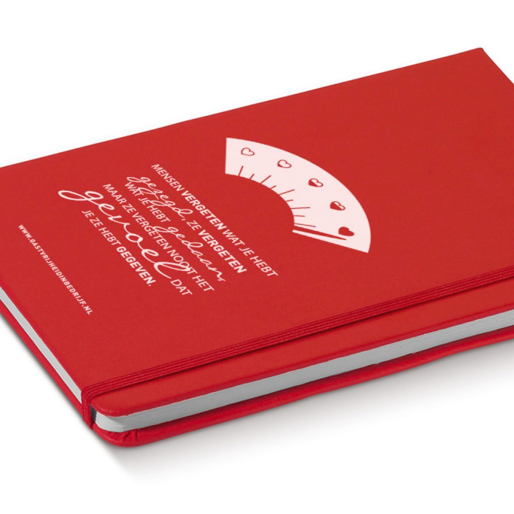 Alle inspiratie die je opdoet bij de gastvrijheidtrainingen bij Gastvrijheid in Bedrijf moet natuurlijk wel een plekje kunnen krijgen. Daarom stelde lekker in vorm voor om naast het bestaande notitieblok ook dit handzame notitieboekje (A6) aan de huisstijllijn toe te voegen. Dat voorstel viel in de smaak, dus regelden we de opmaak van een mooie quote in één kleur op de stoffen cover.