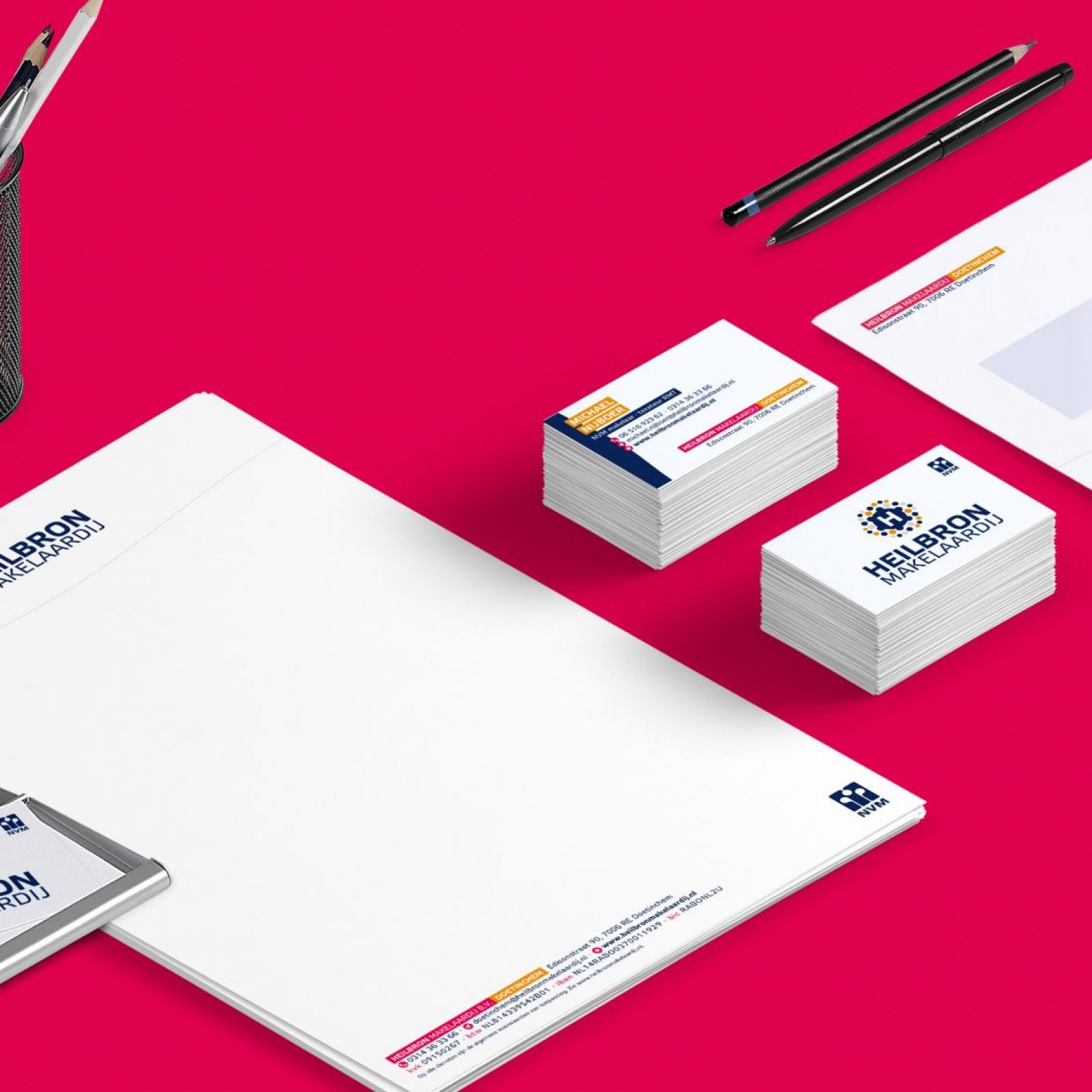 De introductie van een aangepast logo is ook het ideale moment om de bijbehorende huisstijldragers onder de loep te nemen. Bij lekker in vorm ontwierpen we daarom voor Heilbron & Heilbron Makelaardij nieuwe visitekaartjes, briefpapier (om zelf te printen via facturatiesoftware) en enveloppen in uniforme stijl.
