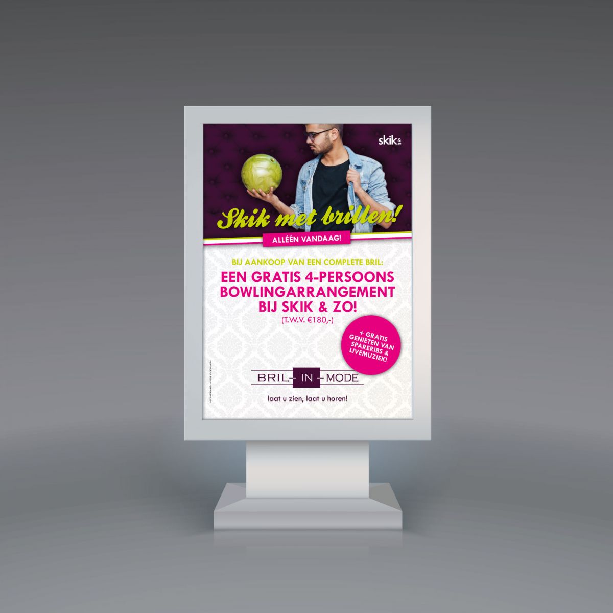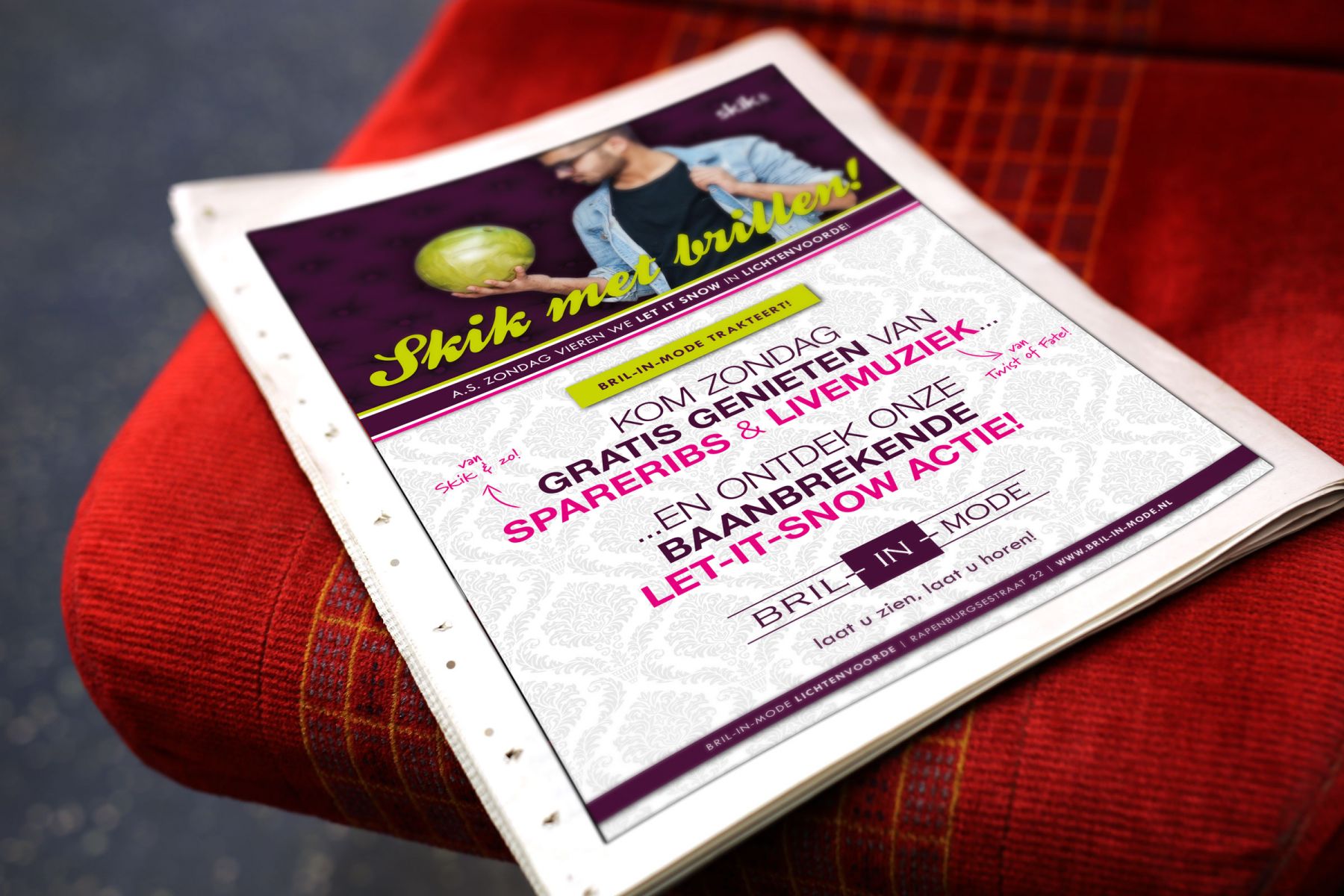 Dit jaar stond Let it Snow bij Bril-in-Mode Lichtenvoorde in het teken van Skik met brillen: kocht je er die dag een complete bril dan kreeg je daar een gratis 4-persoons Skik & zo bowlingarrangement bij cadeau! Geen bril nodig? Dan waren een gratis hapje, drankje en live muziek van de Scrolling Phones. Reden genoeg om alsnog naar Bril-in-Mode te komen!
