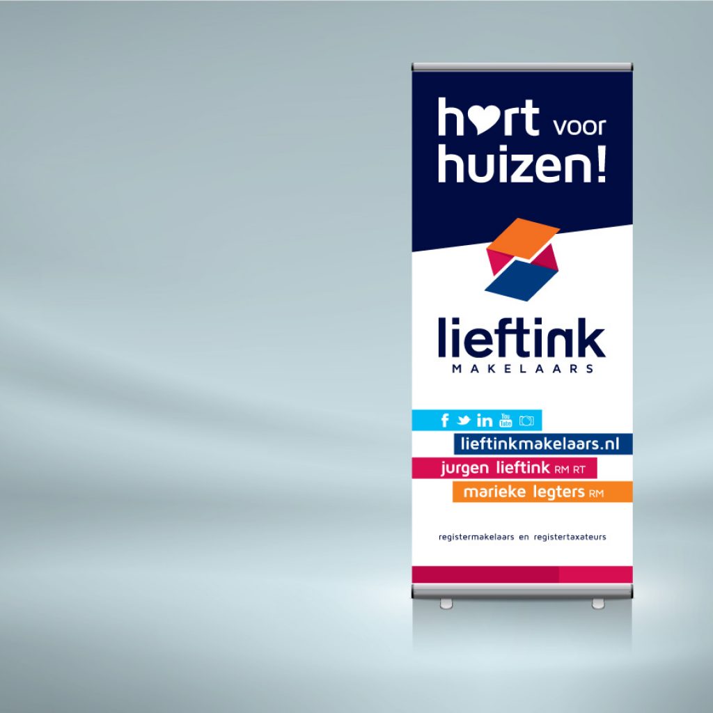 Omdat Lieftink Makelaars nog wel eens op een beurs te vinden is, zoals op de Startersdag van de Rabobank, was er behoefte aan een opvallende roll-up-banner met de juist identiteit. lekker in vorm dacht mee over inhoud en vorm, en regelde vervolgens de productie.