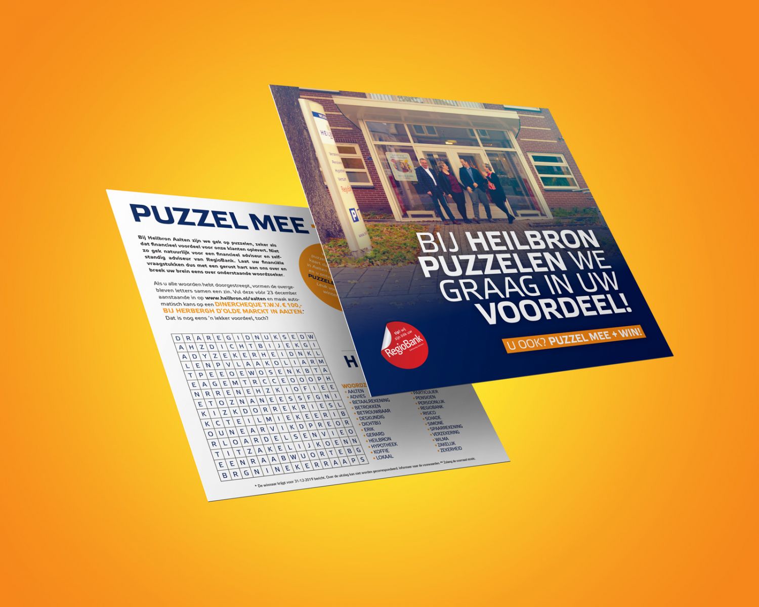 Voor wat extra naamsbekendheid onder de bewoners van Aalten mochten we bij lekker in vorm voor Heilbron Aalten een mailing ontwikkelen met een gezellige puzzelactie, onder het motto ‘Bij Heilbron puzzelen we graag in uw voordeel.” Door mee te doen en de juiste oplossing op te sturen, maak je kans op een dinercheque t.w.v.w. €100,- bij Herbergh d’Olde Marckt in Aalten. Daarnaast kun je de mailing bij Heilbron Aalten inwisselen voor een leuk Heilbron puzzelboekje.