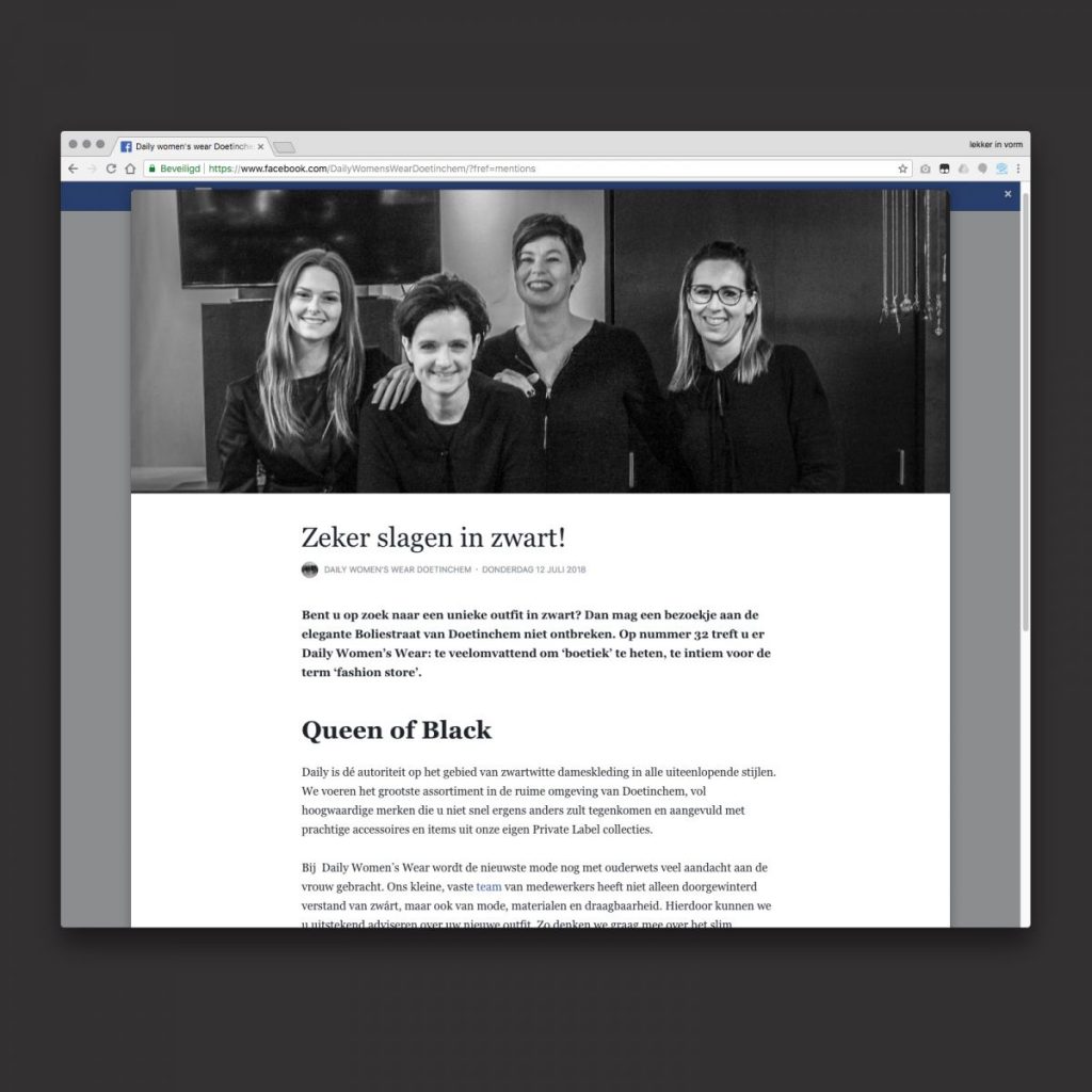 Een belangrijk nieuw onderdeel van Facebook voor bedrijven is Mijn Verhaal; een uitgelezen mogelijkheid om de essentie van je bedrijf aan je klanten te vertellen. Dat past natuurlijk perfect in ons plaatje van een sterk merkverhaal. Voor Daily Women’s Wear mochten we Mijn Verhaal schrijven en opmaken op basis van de gestelde merkwaarden. Je kunt het volledige verhaal lezen vanaf de Facebook-pagina van de Queen of Black.