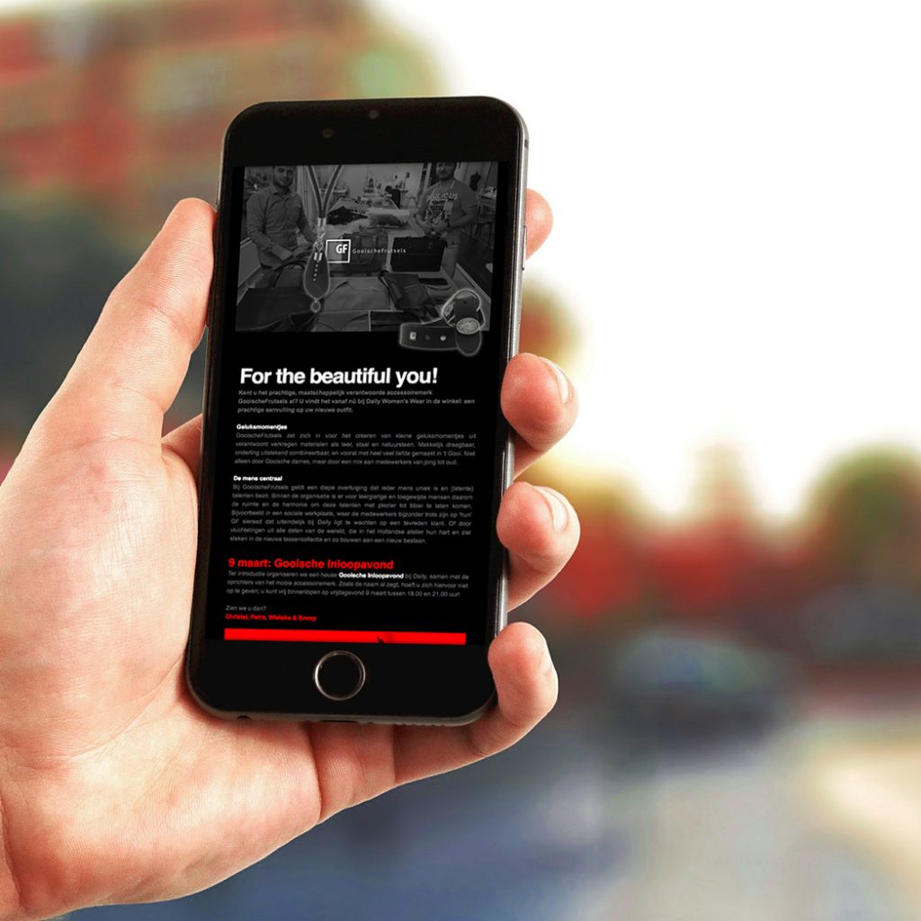 Om het nieuwe merk Gooische Frutsels te introduceren bij klanten van Daily, organiseert de Doetinchemse modewinkel een heuse Gooische Inloopavond, samen met de oprichters van dit maatschappelijk verantwoorde accessoiremerk. lekker in vorm zorgde voor promotie vooraf via een een modieuze Mailchimp nieuwsbrief richting klanten!