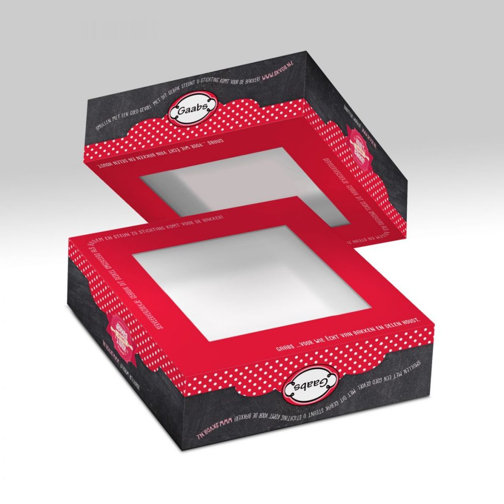 Om Stichting Komt voor de Bakker ludiek onder de aandacht te brengen bij kopers van Gaabs, hebben we een fullcolour zwanenhalsdoos ontworpen. Het verzoek aan klanten is om de gekochte taart of cupakes te serveren in het omgekeerde deksel. Op die manier ontstaat niet alleen een vrolijke en smaakmakende serveersuggestie, maar komt ook de boodschap van Stichting Komt voor de Bakker leesbaar in beeld voor alle gebak-eters.