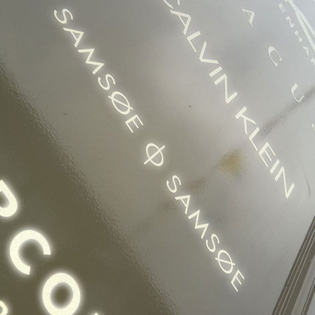 Om de stoere mannenmerken van T-Time Men’s Wear prominenter in beeld te brengen, voorzag lekker in vorm het houtwerk van de gevel van diverse logo’s uit reflecterend folie.