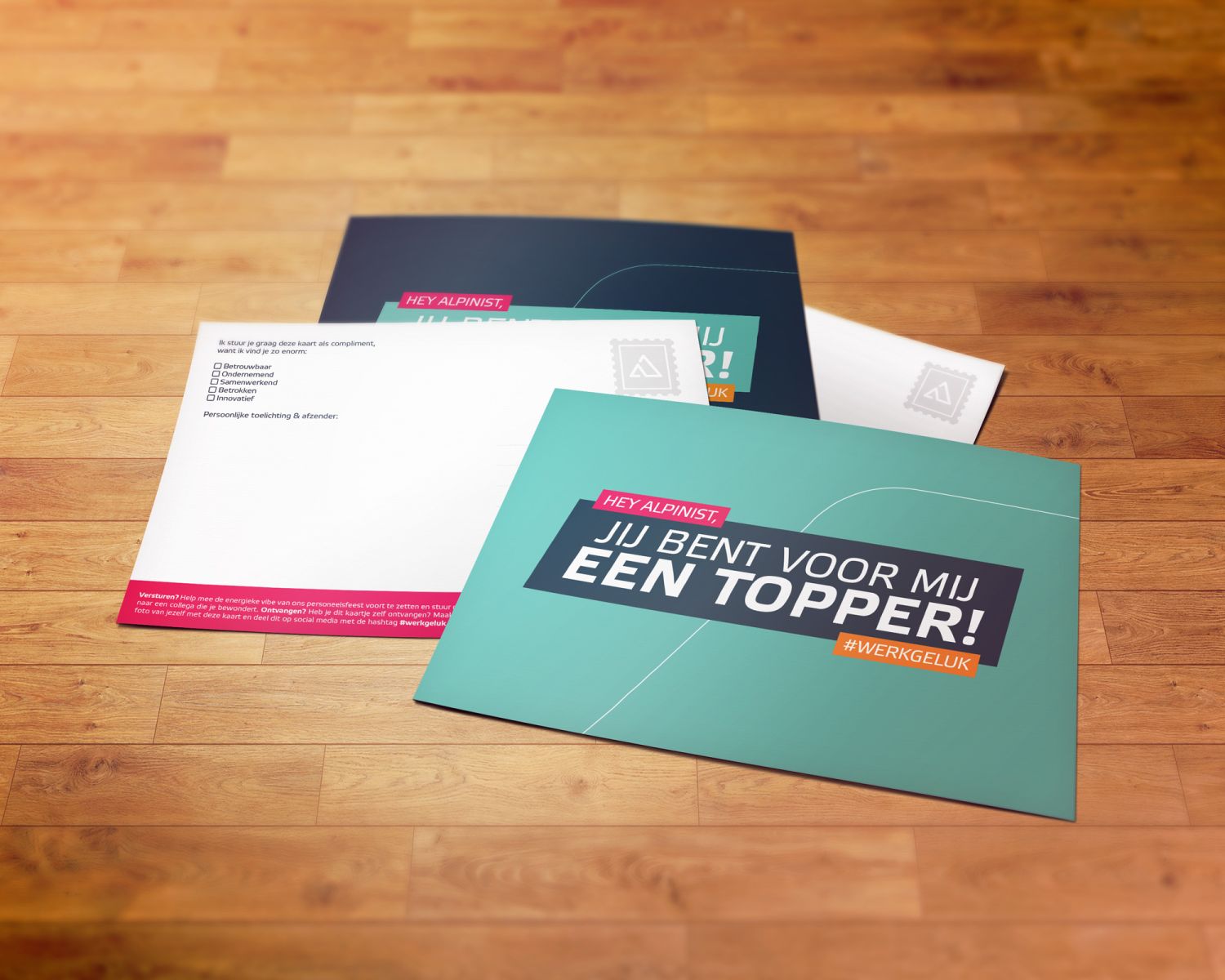 Bij lekker in vorm mochten we meehelpen om er een geslaagd feest van te maken, via uitnodigingen vooraf en branding tijdens het feest zelf. Daarnaast ontwierpen we een ansichtkaartenset voor in de goodybag na afloop: een leuke tool waarmee collega’s de vibe van het feest kunnen voortzetten door hun waardering naar collega’s uit te spreken.