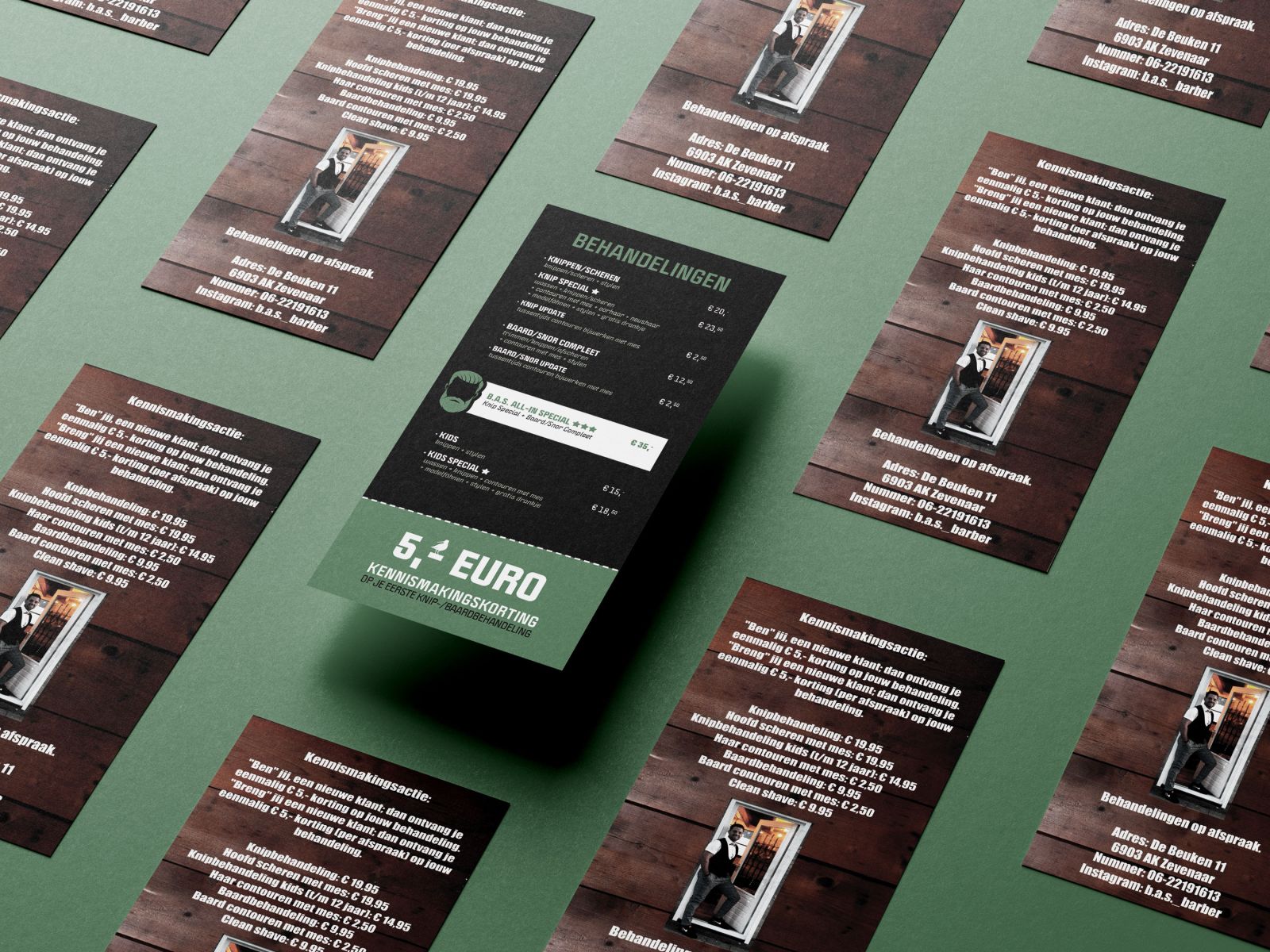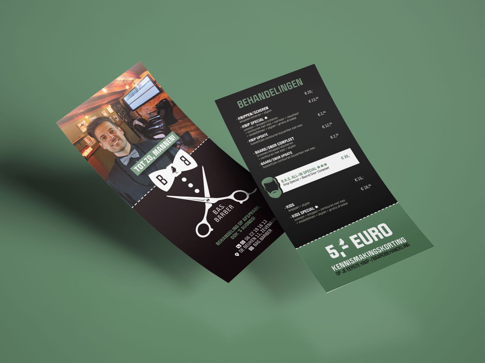 Na restyling van zijn logo mochten we ook de flyer / prijslijst van Bas Barber onder handen nemen. Zijn gezicht en salon kregen hierop een meer prominente plek, voor herkenbaarheid en laagdrempeligheid. Daarnaast dachten we kritisch met Bas mee over een duidelijke indeling van zijn prijzen en een opvallende plek voor zijn kennismakingsactie. Uiteindelijk hebben we de flyer op lekker stevig papier laten drukken, zodat deze qua uitstraling past bij de kwaliteit van de salon.